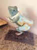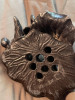 This is a leaf shaped copper tray with a bronze cast frog. The edges of the leaf are curled up. There are no artist or maker marks