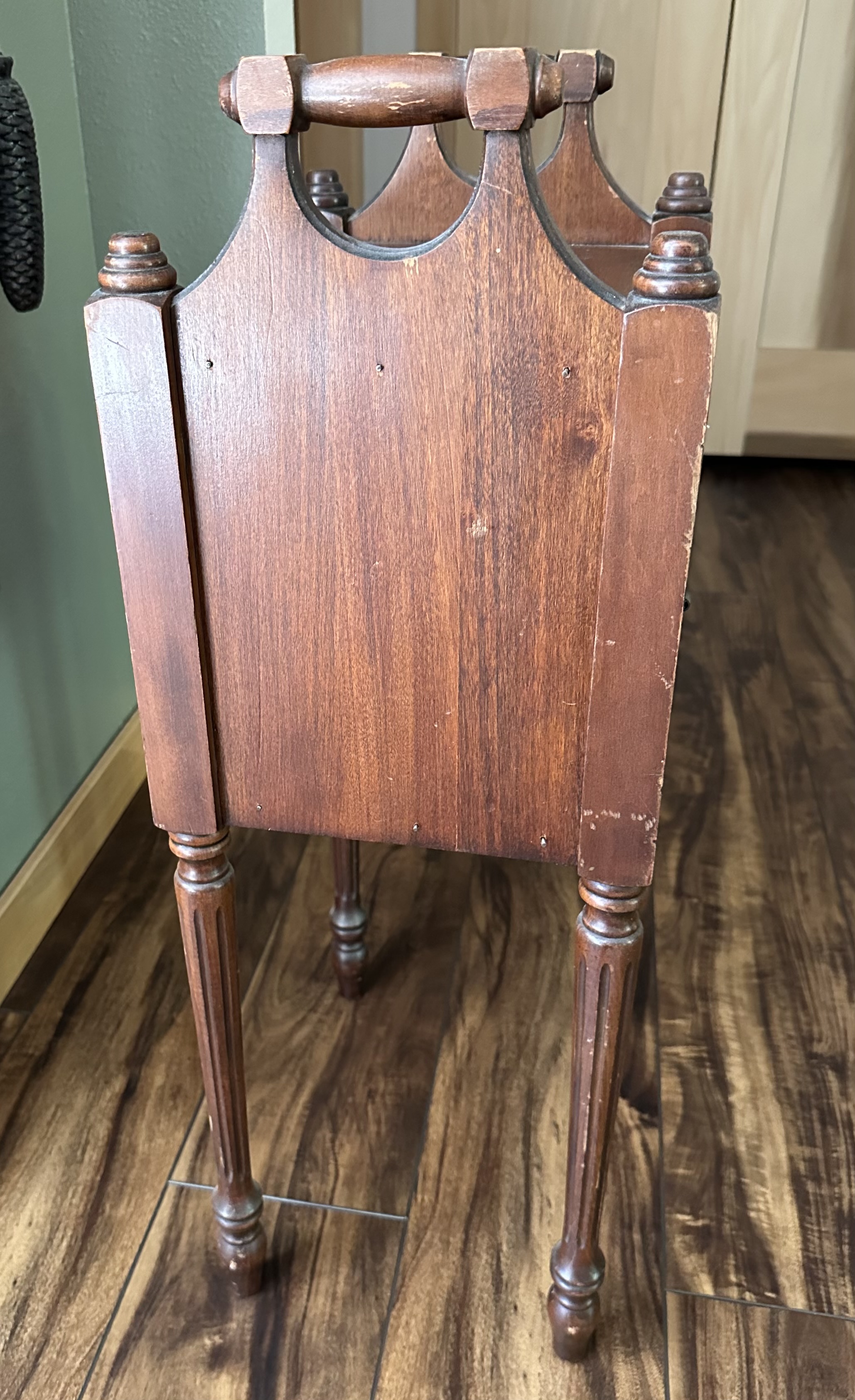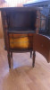 This small side table features a wooden construction with a rich finish and is equipped with handles for ease of mobility. It has a box compartment that opens up, revealing a copper-lined interior, which adds a unique touch to its functionality. The dimensions of the table are approximately 11 inches in width, 13 inches in depth, and 29 inches in height. The table is supported by four turned legs with decorative detailing.