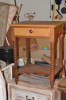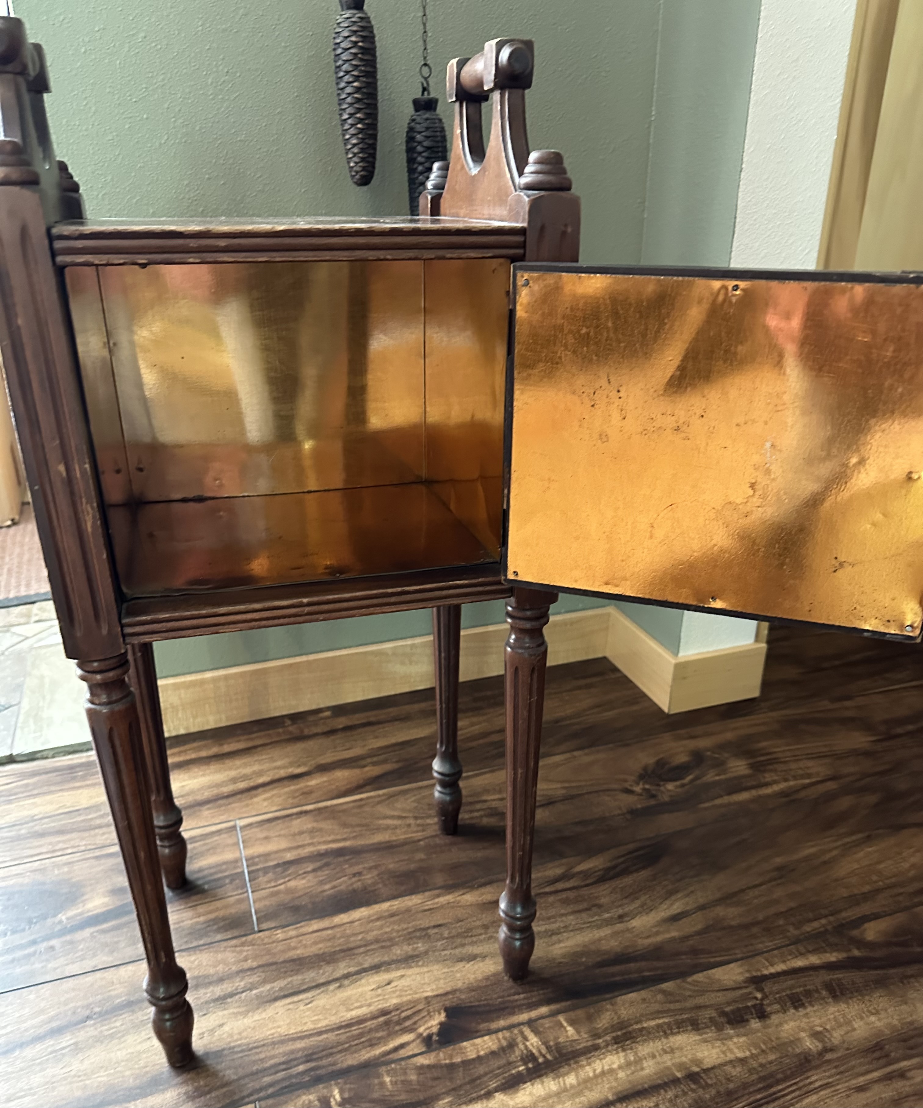 While the maker and exact date of production are unknown, this style of side table is reminiscent of early to mid-20th century design trends, particularly in American furniture. The use of copper lining suggests it may have been designed for practical use, possibly as a storage unit for items that benefit from a copper environment, such as linens or small kitchen items.