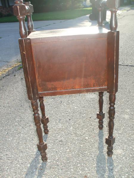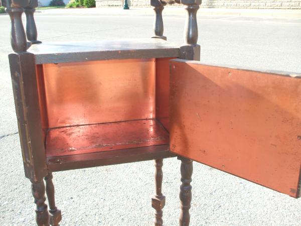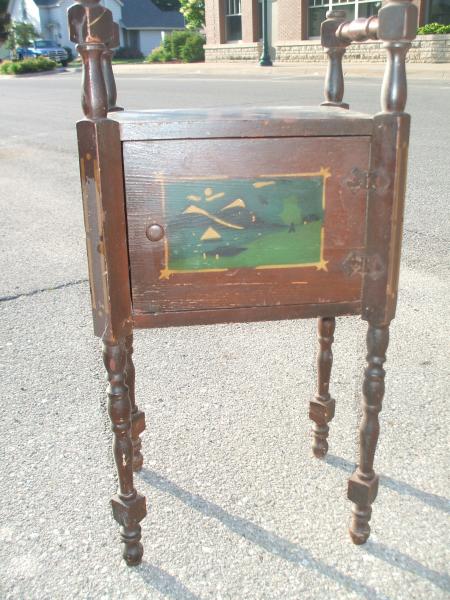 This is a stand I am told is a smoke stand. It is made of wood and has been painted. The lining is copper and is in good condition.