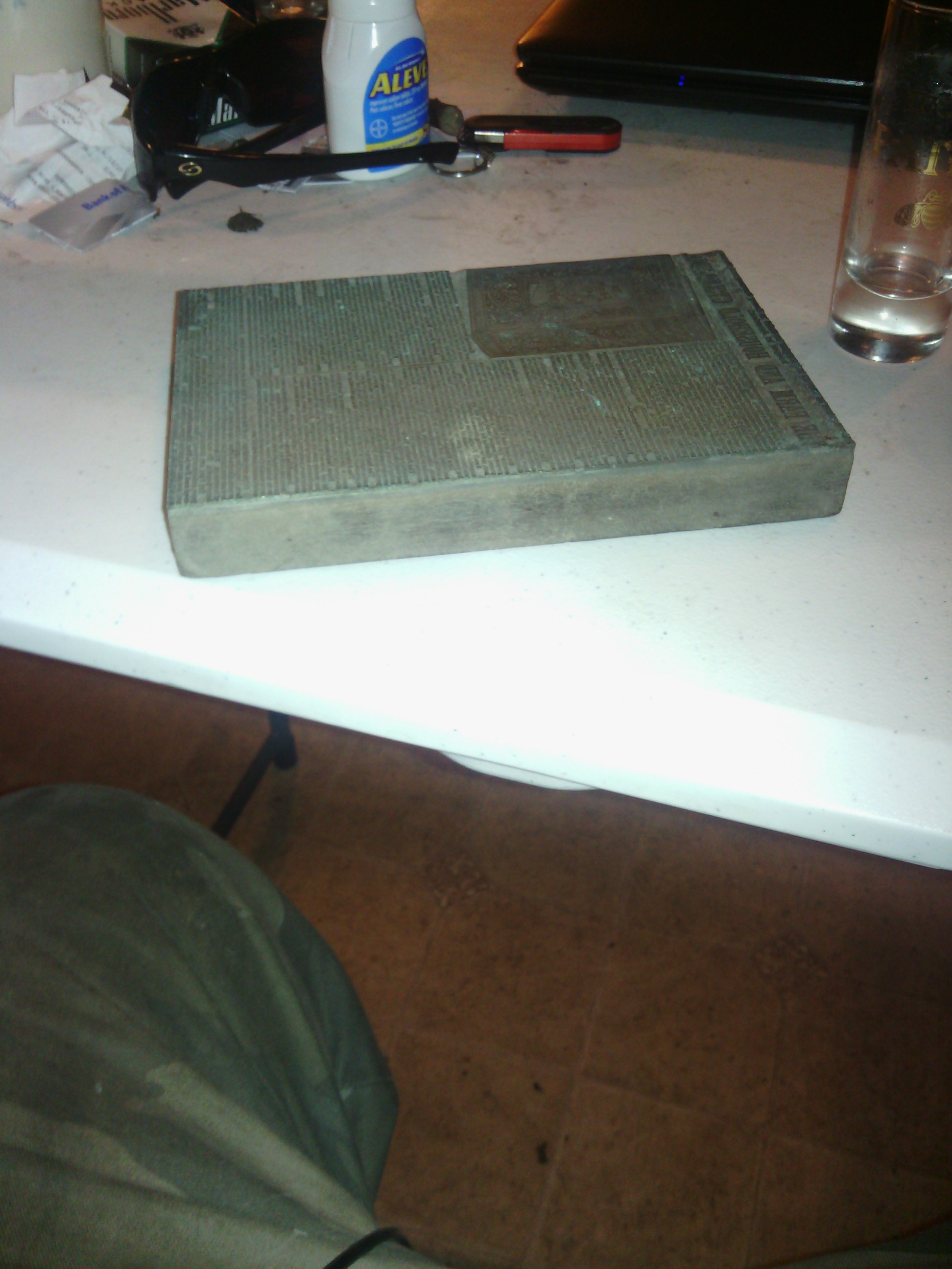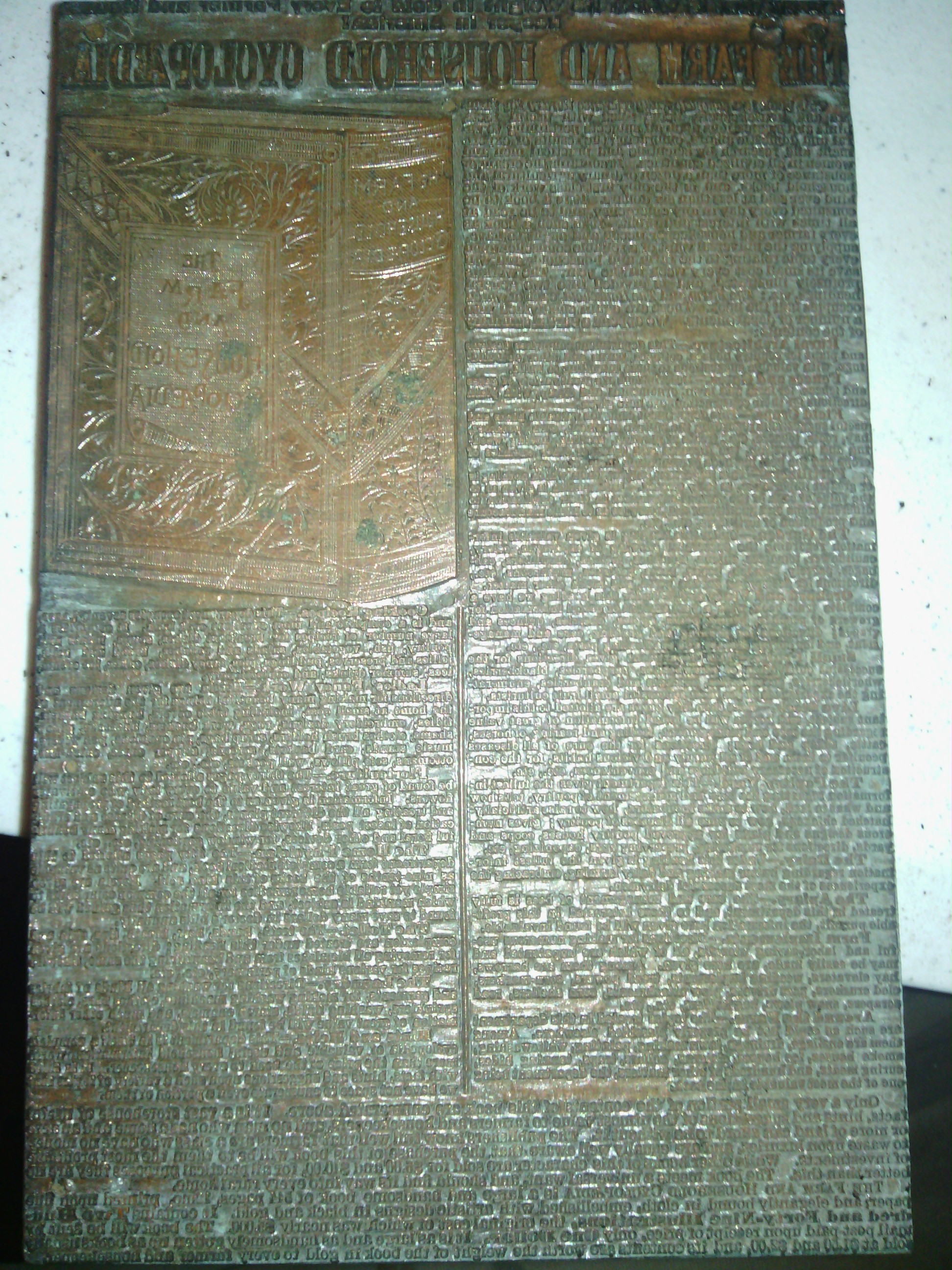 Very old, copper print plate nailed to a wooden block. Very heavy. Advertises a book called "the farm and household cyclopeadia." No information could be found on the Internet. Was found in an old root cellar.