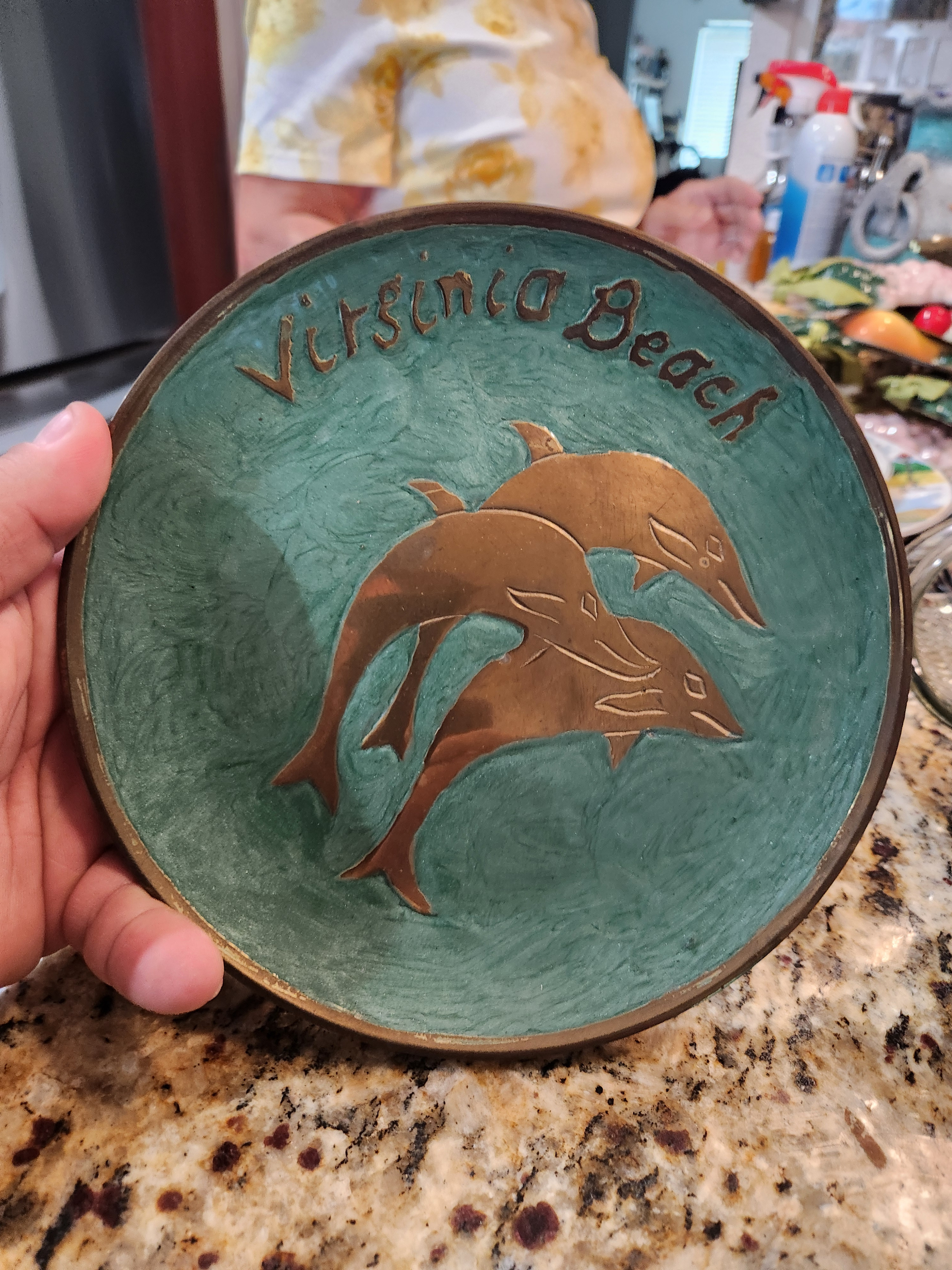 While the specific maker of this plate is unknown, decorative copper items became popular in the late 20th century, particularly in coastal tourist areas. Virginia Beach, known for its marine life and tourism, likely inspired the dolphin motif, reflecting the local culture and environment.