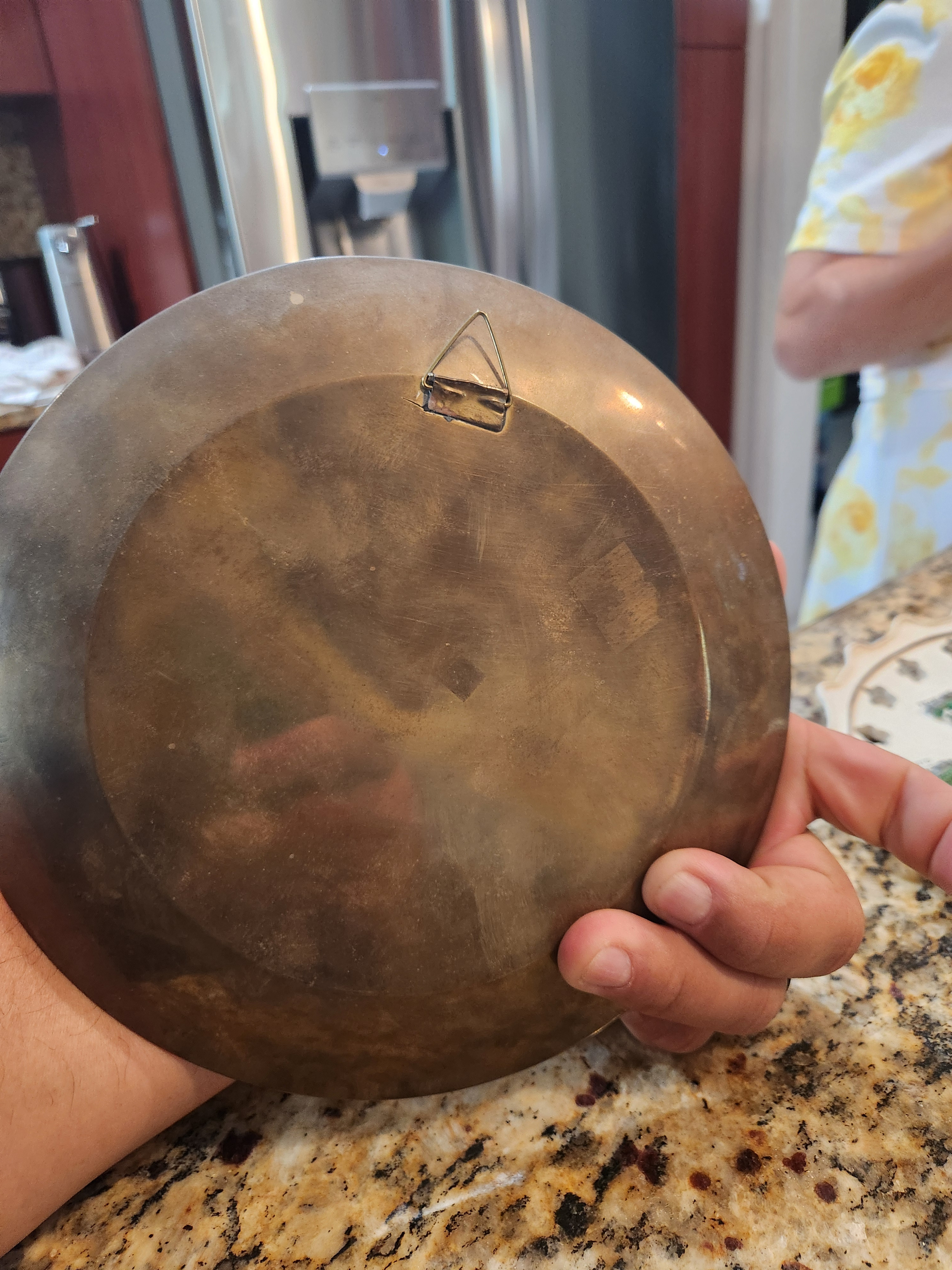 • Back: Copper oxidation/patina consistent with age. The wall hanger is functional but shows solder residue and wear.