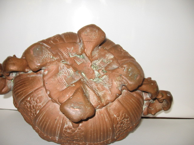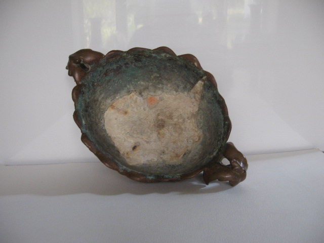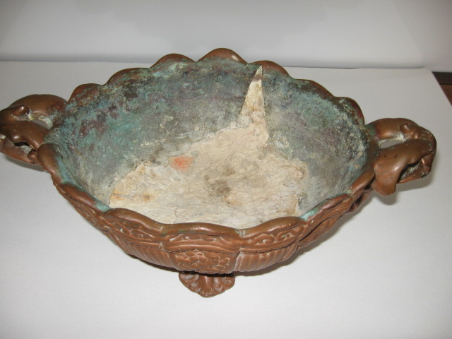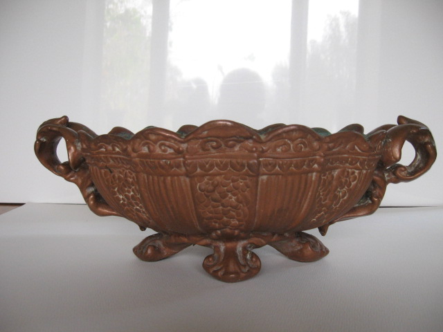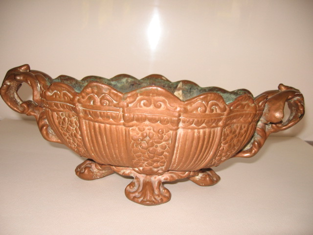 I have this copper on pottery footed bowl. I bought it in a junk store in Arkansas in the 1960's just because I thought it was very pretty. I have enjoyed it all these years but I don't have a clue how it was made. It almost looks ancient. i think it probably is handmade. It is 8 3/4" wide, 13 3/4" long and 4 3/4" tall. It has water sediment on the inside, probably had been used for a plant. The copper is mostly gone from the inside of the bottom but the copper is still completely over the outside. There are no identifying sympols that I can tell but there are marks like a fork type instrument was used to press the copper on the bottom. There is a small wire loop on the bottom and there are 2 rusty lines in the pottery on the inside. I would love to know who, where and how it was made and if it has value what the value is. I am attaching pictures which were taken some years ago after I had cleaned the copper but since I haven't cleaned it again the old patina is returning.