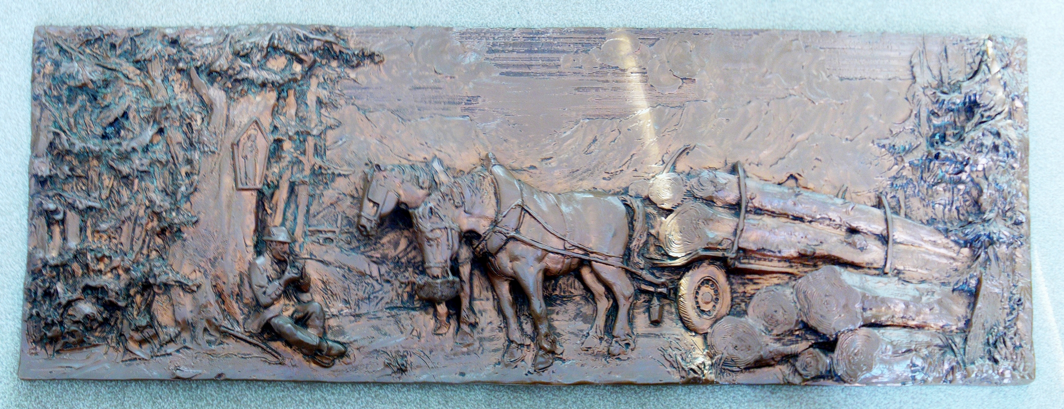 Large, heavy, solid copper-plated wall plaque, measuring 120cmx43cm and weighing 15kg. The relief scene depicts a horse drawn log cart, with a gentleman resting beneath a tree with what appears to be a saint/Madonna shrine on the tree trunk. The scene appears to be of Germanic origin, possibly dating from 1920's onwards, as the cart appears to have pneumatic tyres.