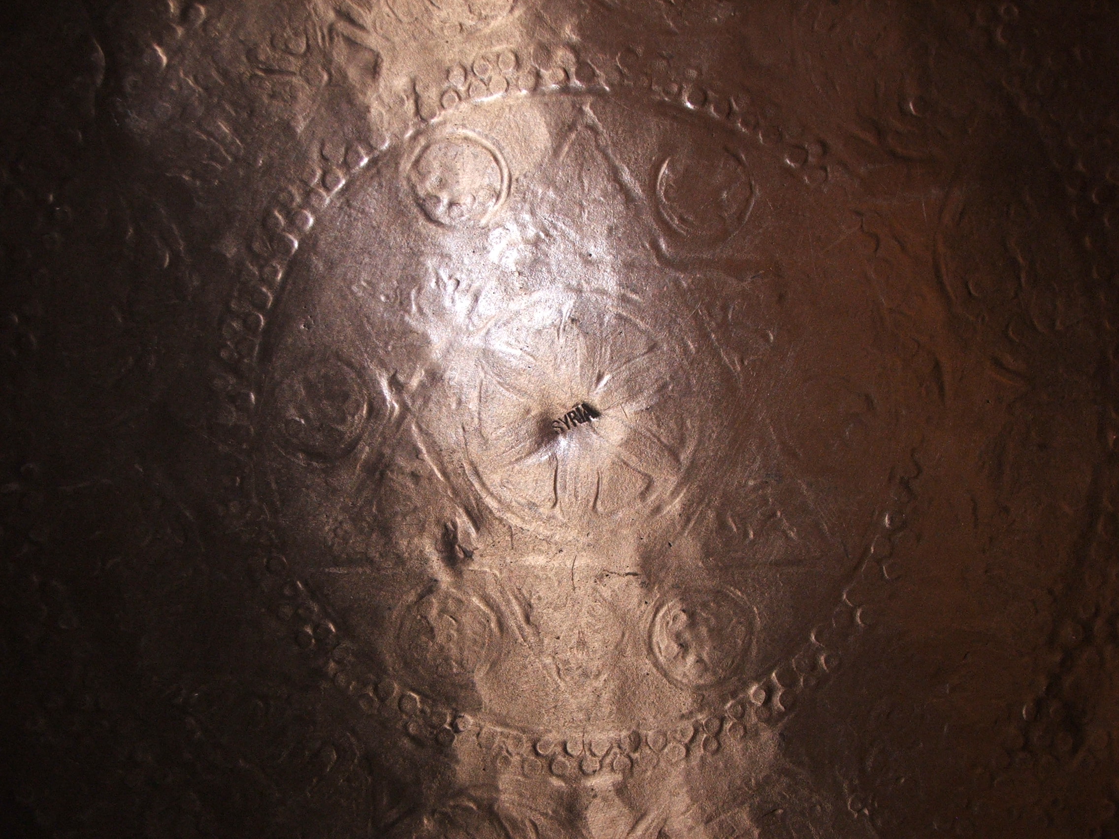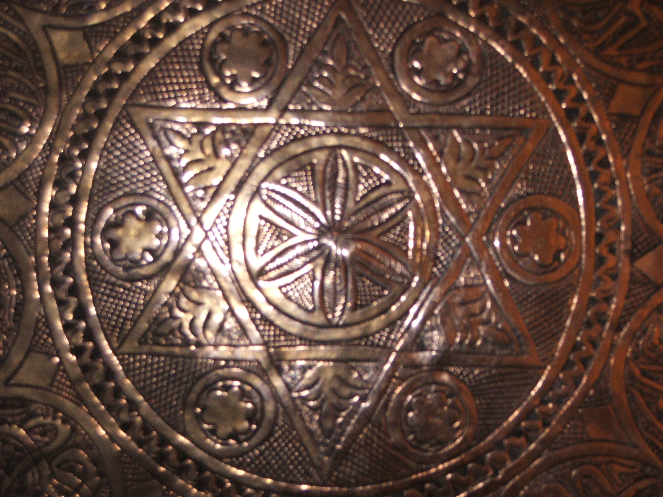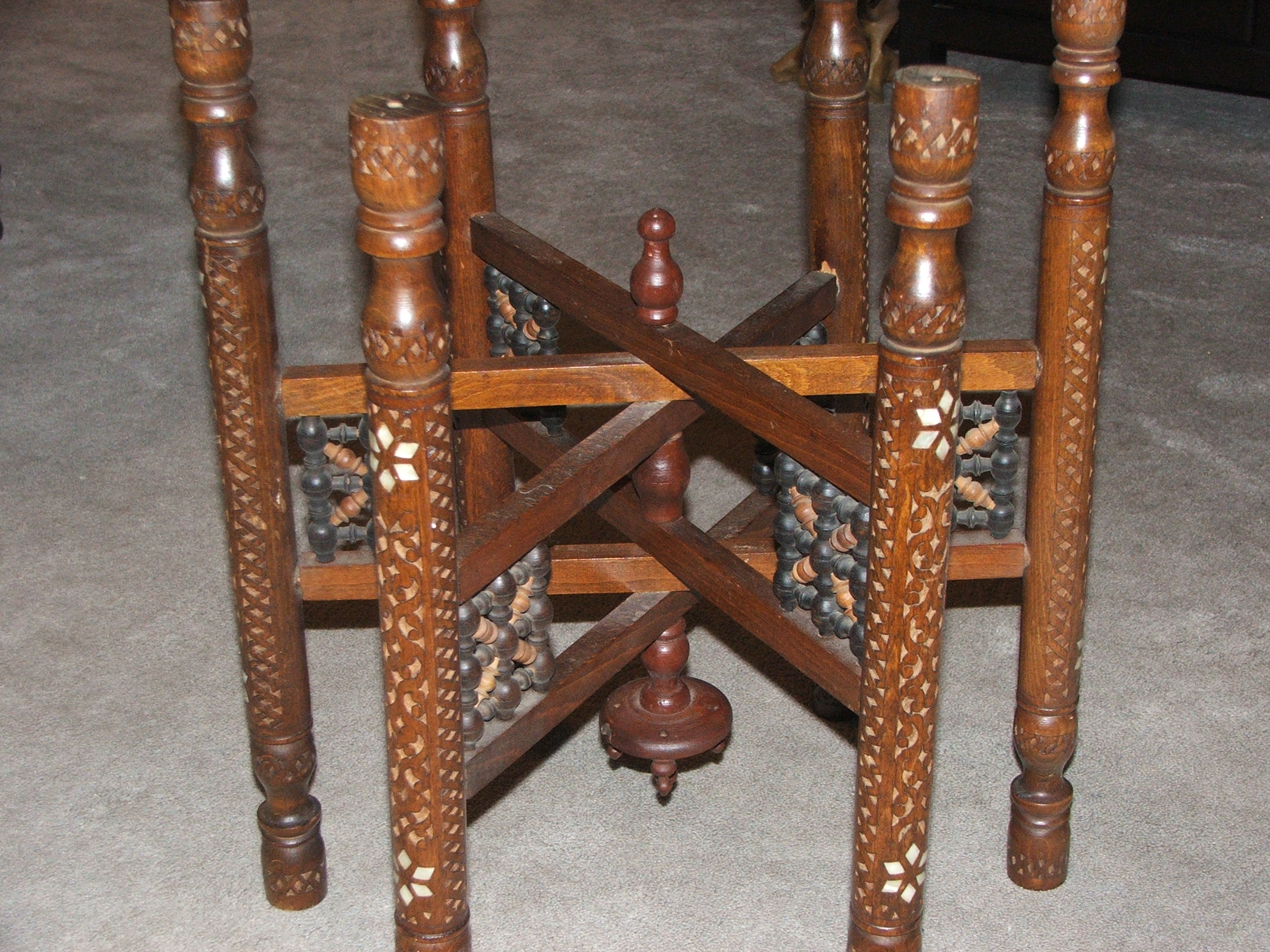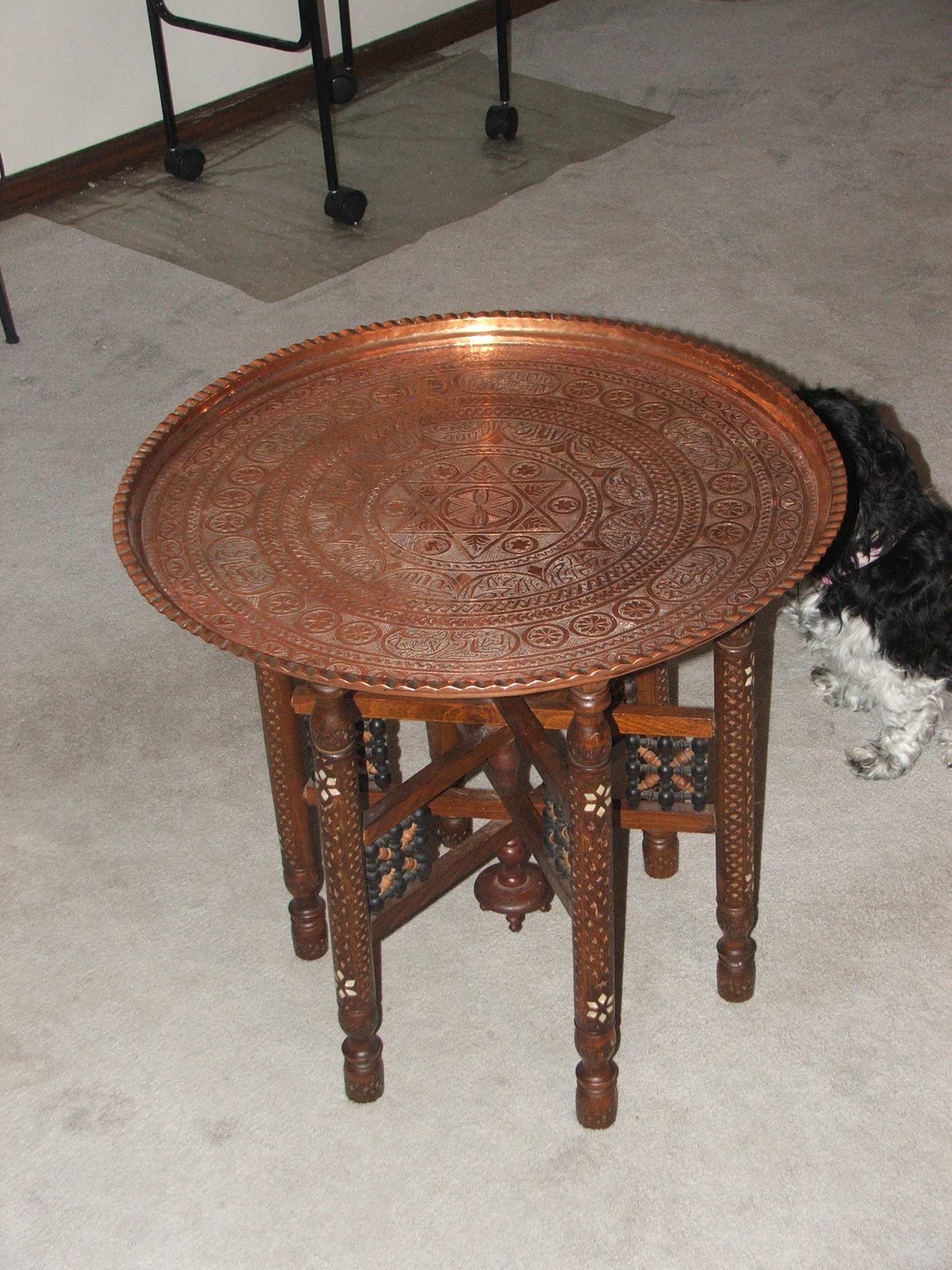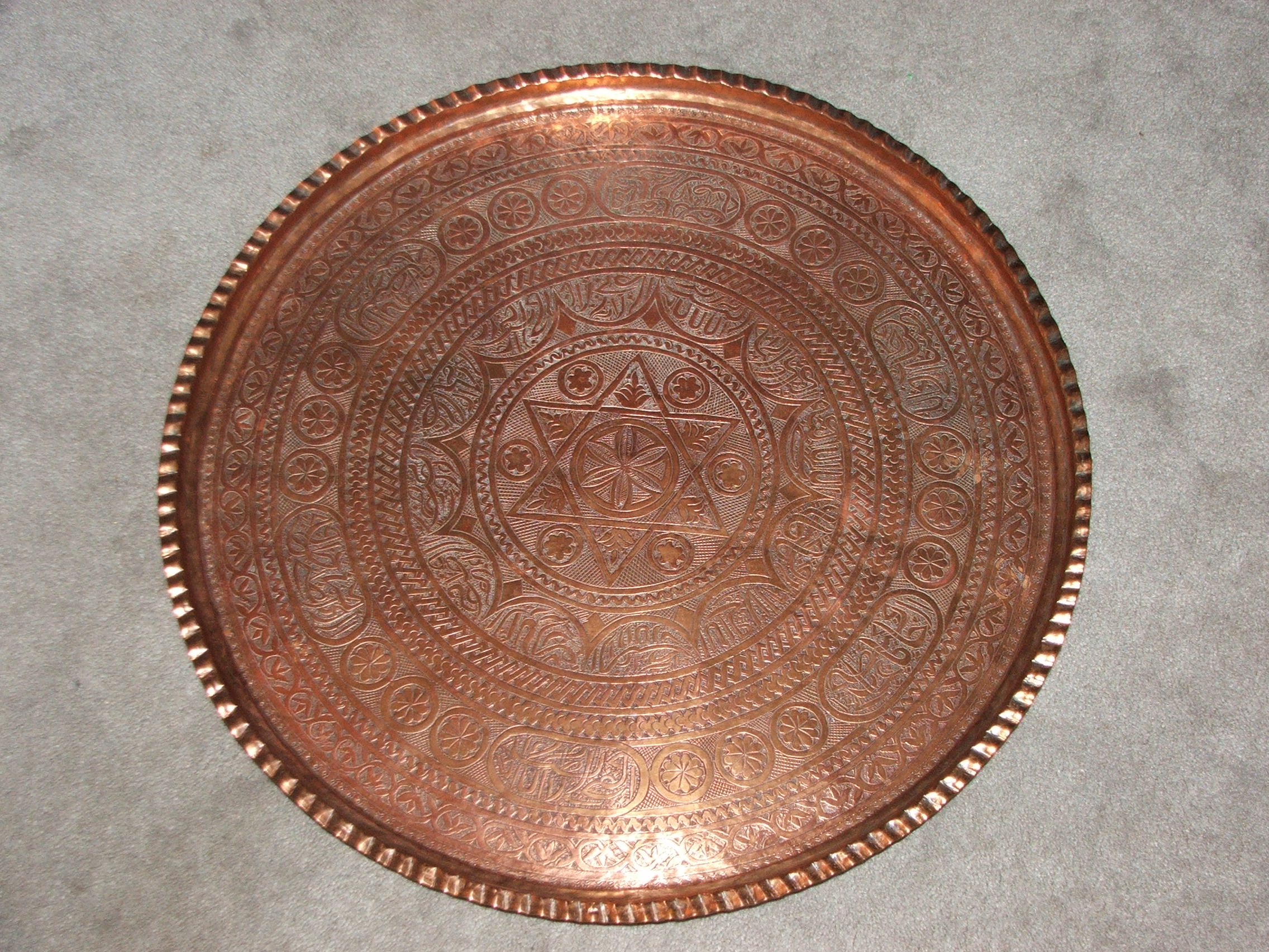 This is a beautifully datailed copper table top or serving tray, with a gorgeous wooded stand ( very detailed) . It is from Syria. please see pictures