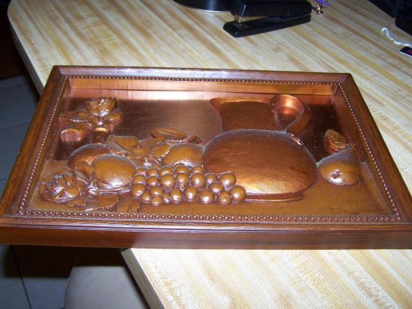 This was my grandmother's before 1950. Then my father gave it to me. It is a copper back with a tea pot and fruit. It is a 3-d image in a frame.