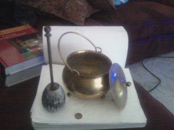 The pot is copper with a lid and a "heatable stone stick". The stone is split but still on the copper shaft. The auctioneer called it a toddy maker. It looks like it was actually used, not just for show.