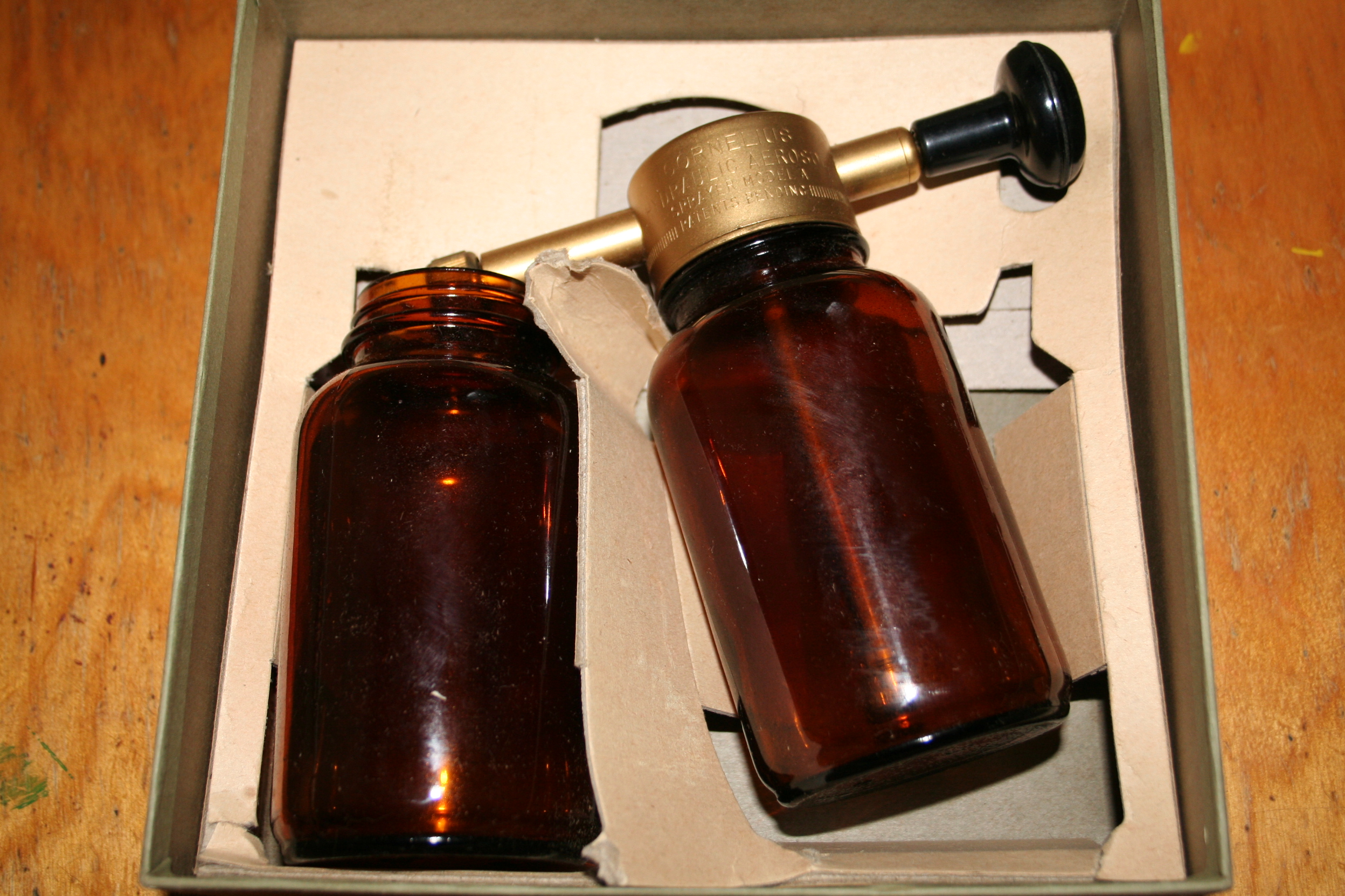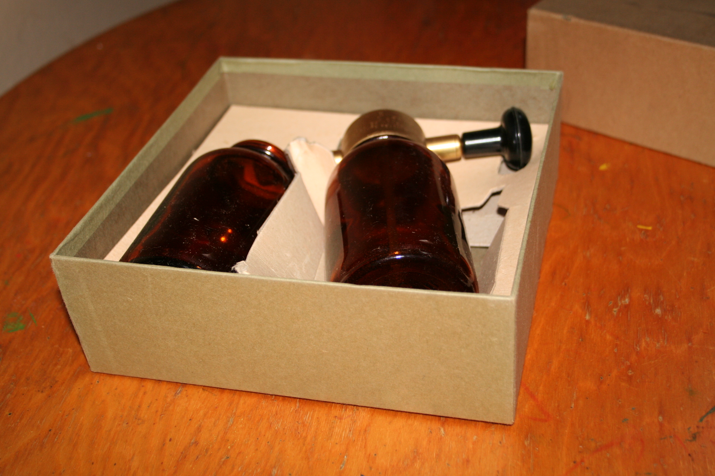 Item includes the original box. Box cover has rip on one corner. No damage to the bottle. A few scratches to the surface of the brass nozzle part, but the sprayer is otherwise pristine. Lettering is clearly legible. Includes original cardboard insert with the box. Spare spray bottle without nozzle is included, and is in pristine condition - no cracks or damage. Item appears to pre-date 1950's. Original box is in very good condition except for rip on one corner, lettering on box is clearly legible.