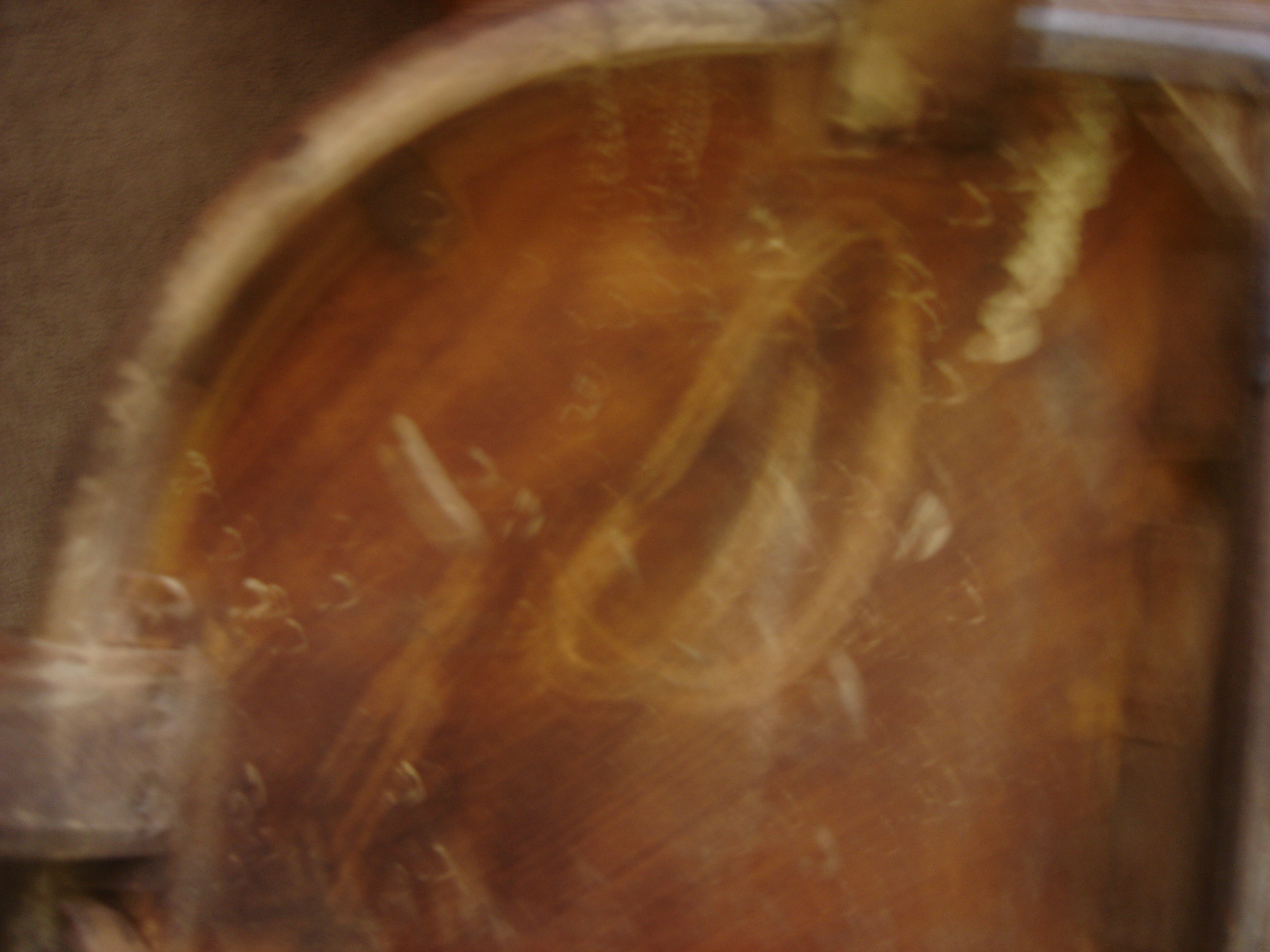 possibly oak , it is heavy.It belonged to my mother-in-law and she had it for at least 60 yrs. I have had it for about 20 yrs. The only mark I have found is a o witha slash thru it.