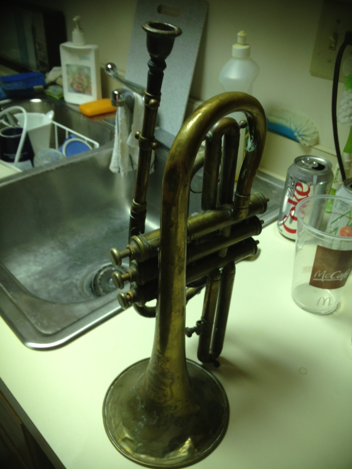 A cornet or trumpet, 3 buttons, mouthpiece included. Bell has small dents.