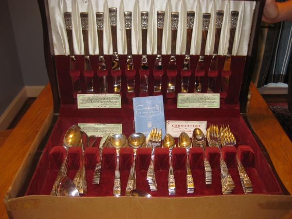 This is a Coronation in Community by ONEIDA, circa 1936, 76 piece service for 12, plus additional, for a total of 93 pieces in it's original Anti-tarnish chest. Chest has slight fading along the edges, but is still in very good condition considering the age. The set has never been used to my knowledge. It still has the original price card for the 76pc set, $101.75, also has the guarantee, all in excellent condition.