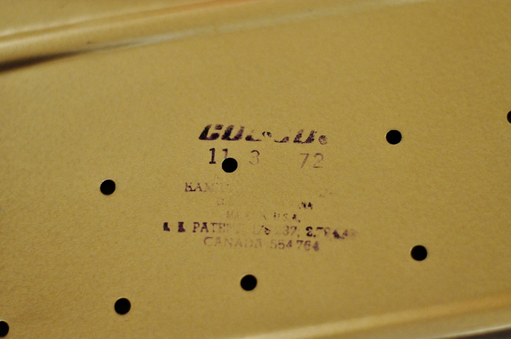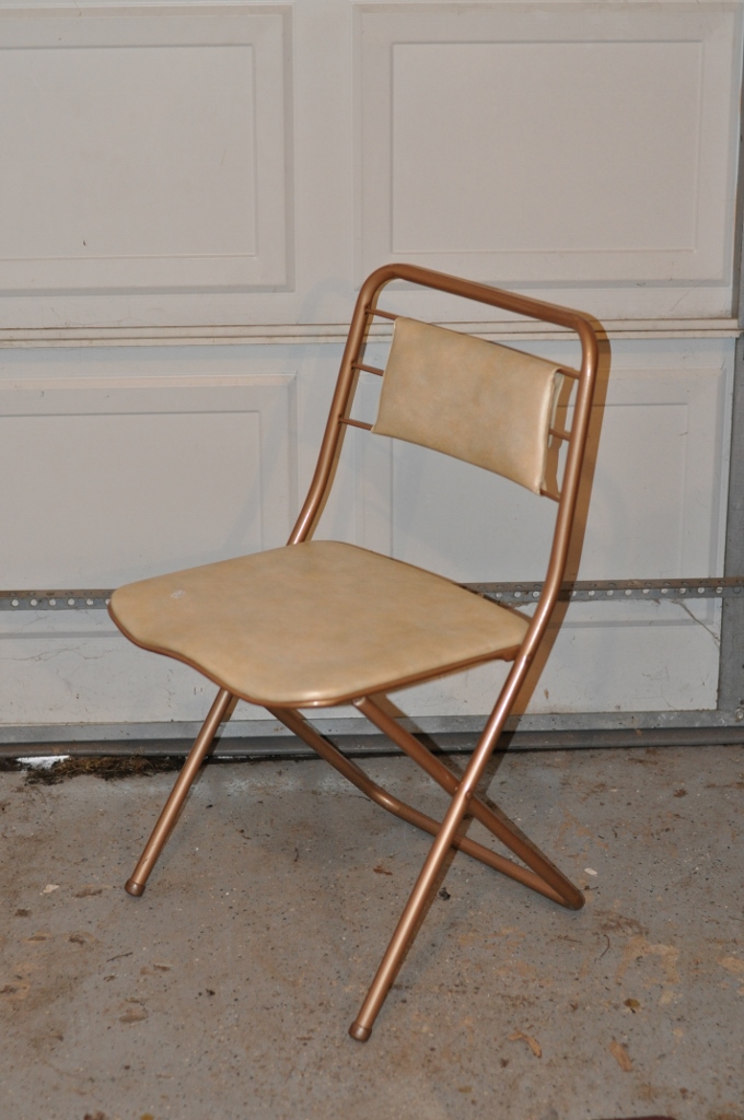 I have a set of four of these "gate" folding Cosco chairs.  The vinyl is in great condition (on chair has one small tear).  The paint is copper/gold in color and is in great condition, also.  there are three rungs on the back of the chairs and they have a vinyl "wrap" that can be removed with it's snap.  the seat is formed and there are no wrungs on the legs.   Stamp on the bottom says COSCO 11 3 72 .  there is usa patent number i can't make out and the canada one is 554764