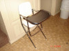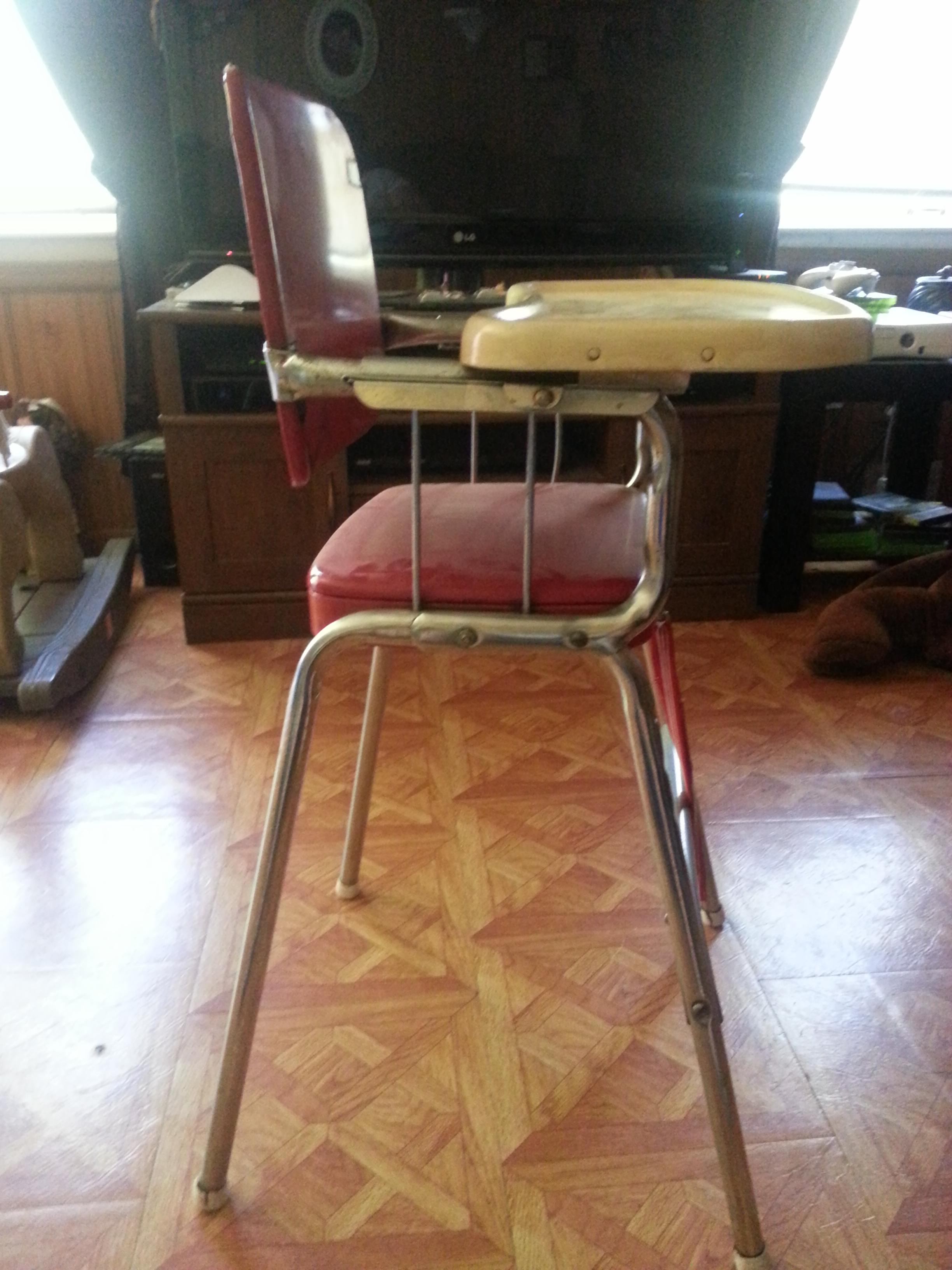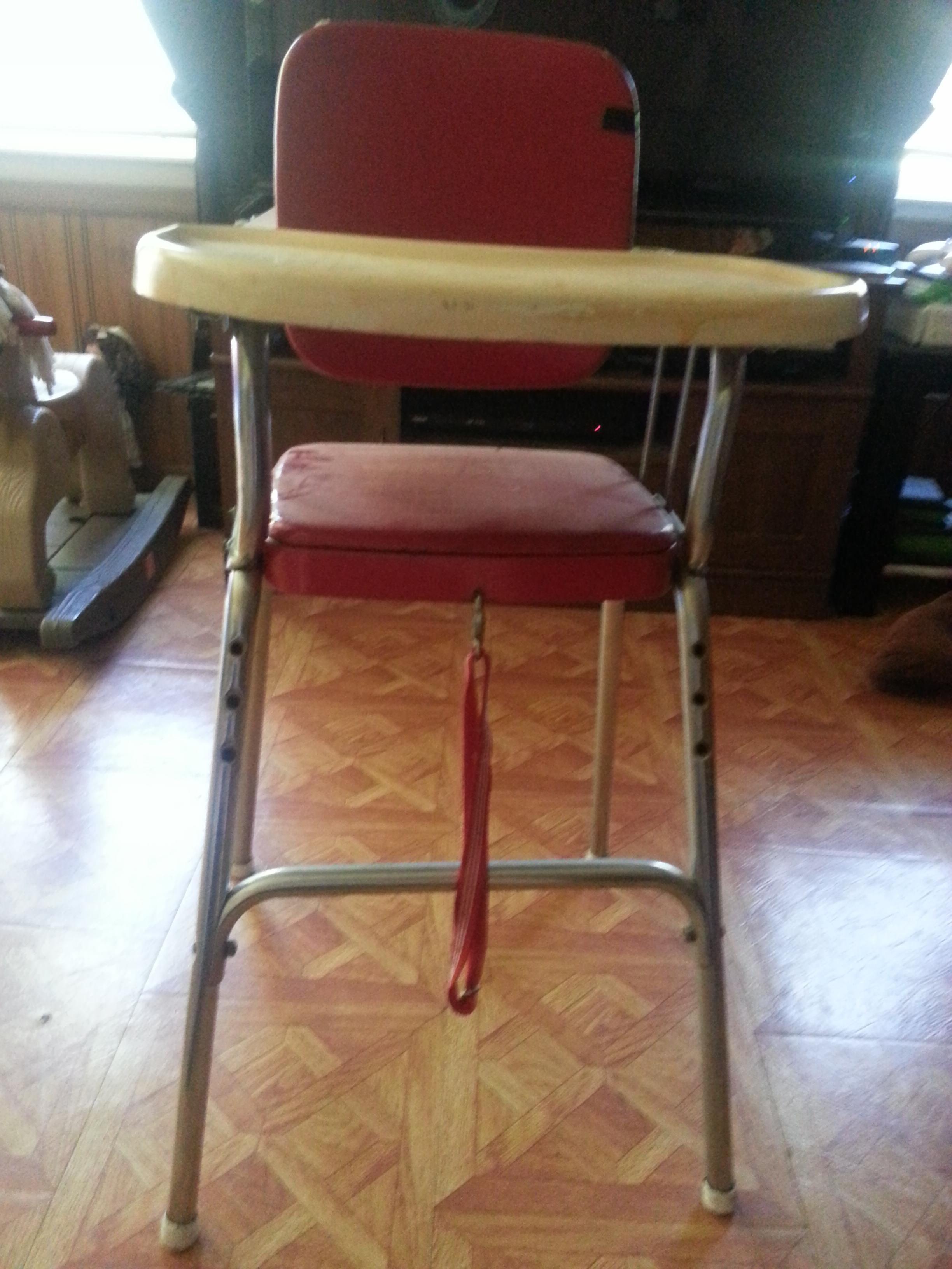 It is metal with red seat and back, has the strap that clips to the front and back if chair to hold the child in, you pull they tray from the sides to take it off.The bottom has hamilton cosco inc on it.