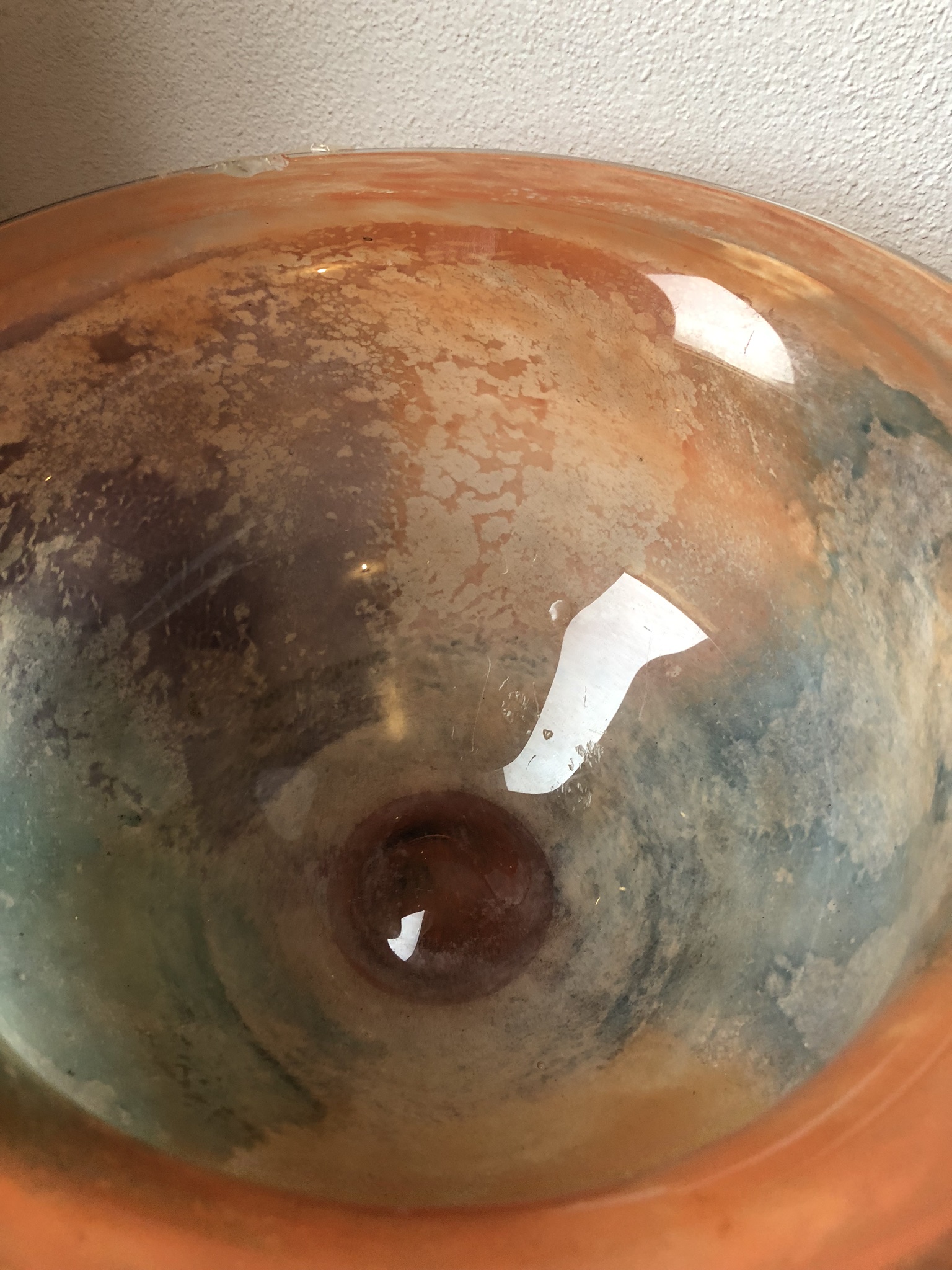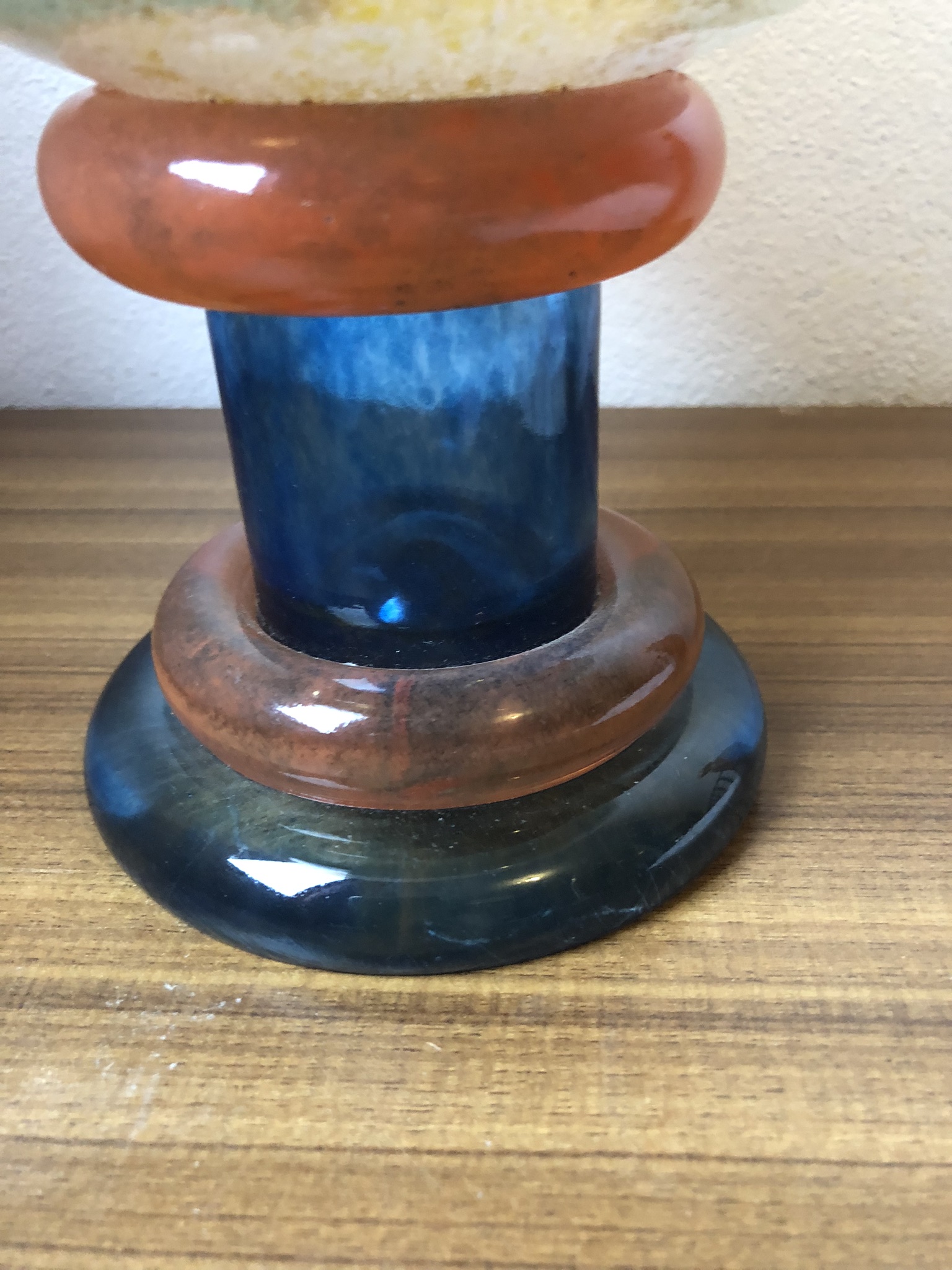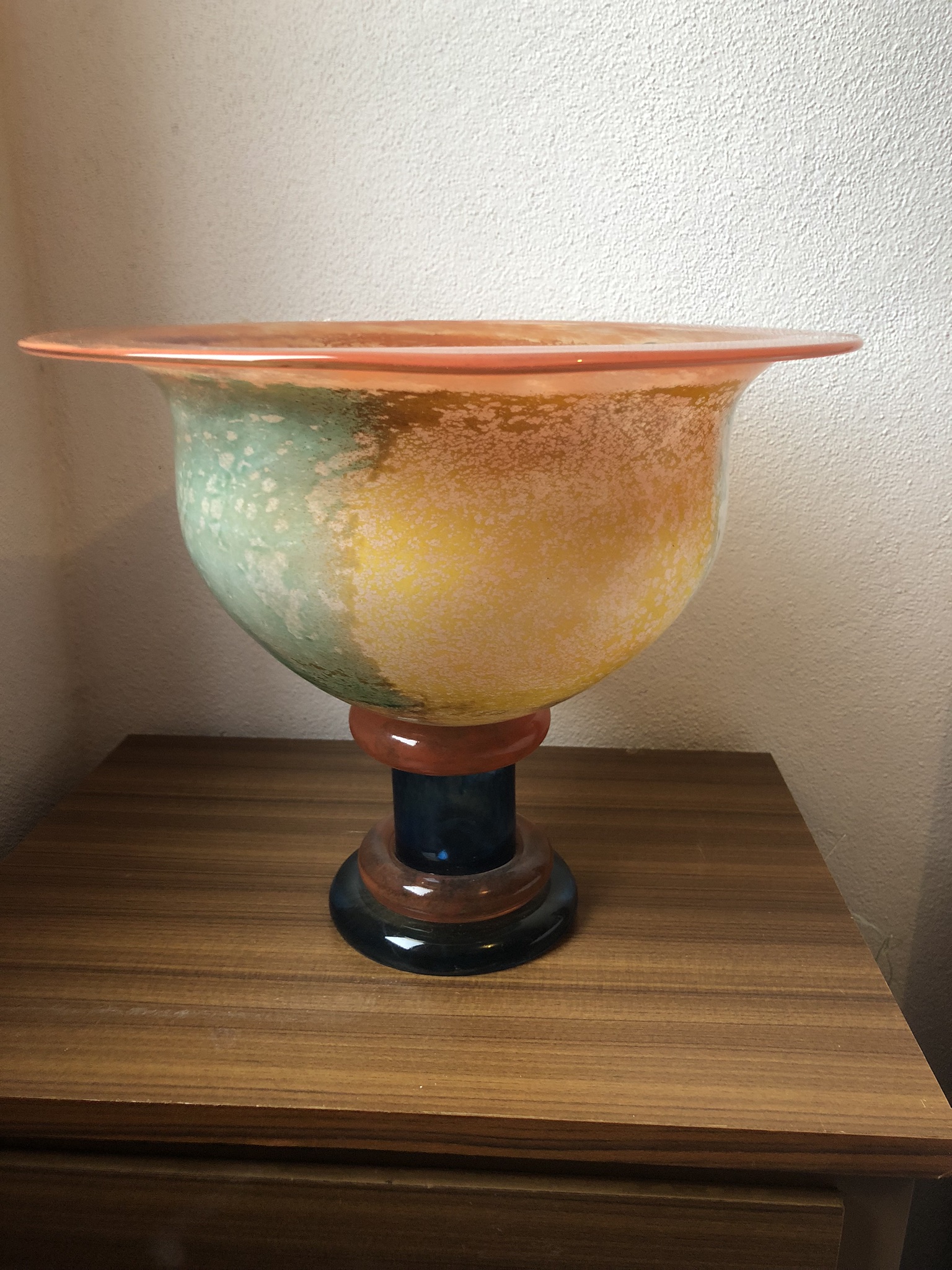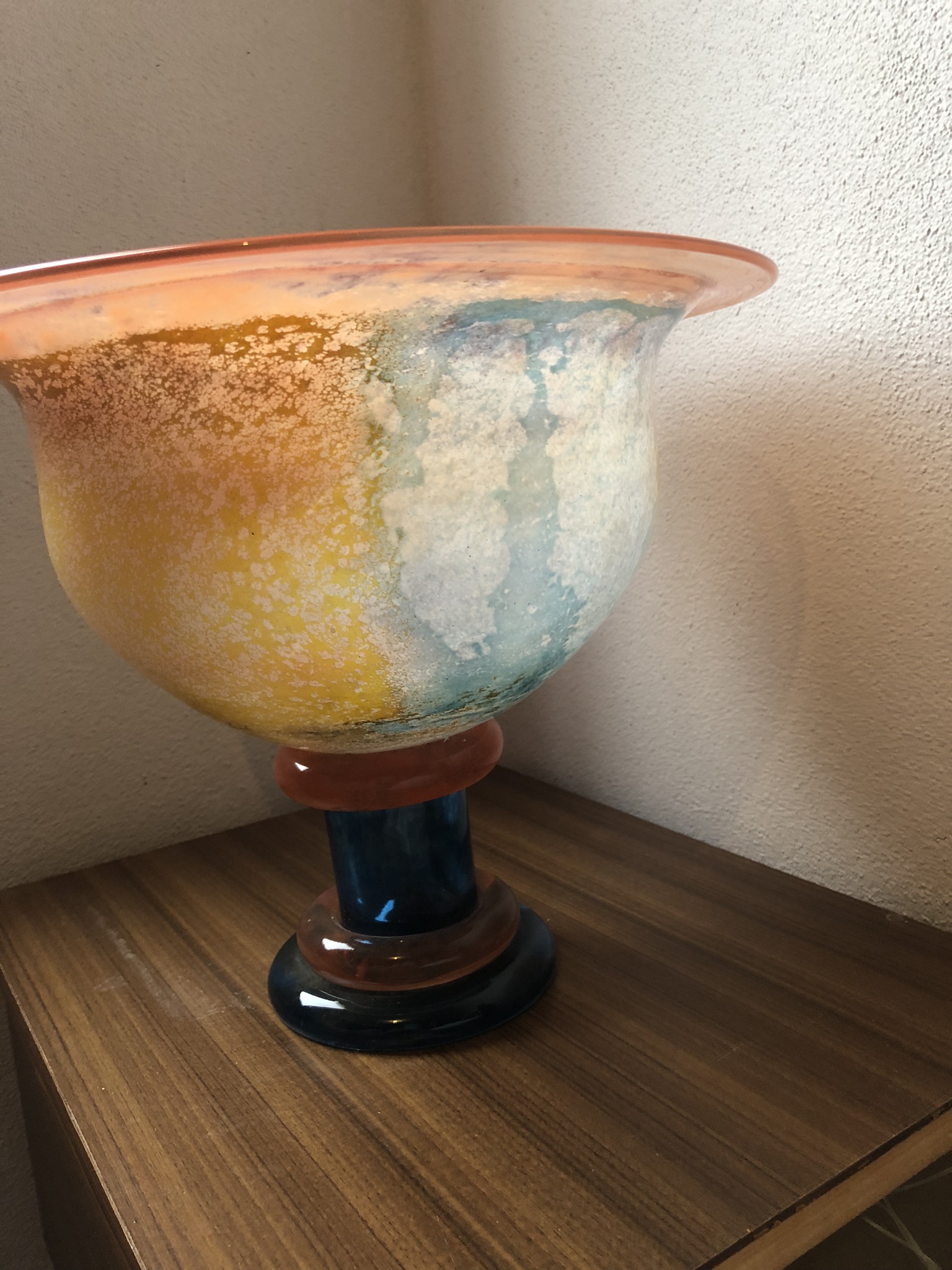 This piece is by costa boda. It has lovely colours of blue/green, orange, brown and dark blue. It is quite heavy. It’s in very good condition, it only has a bit of chipping to the top of the rim.