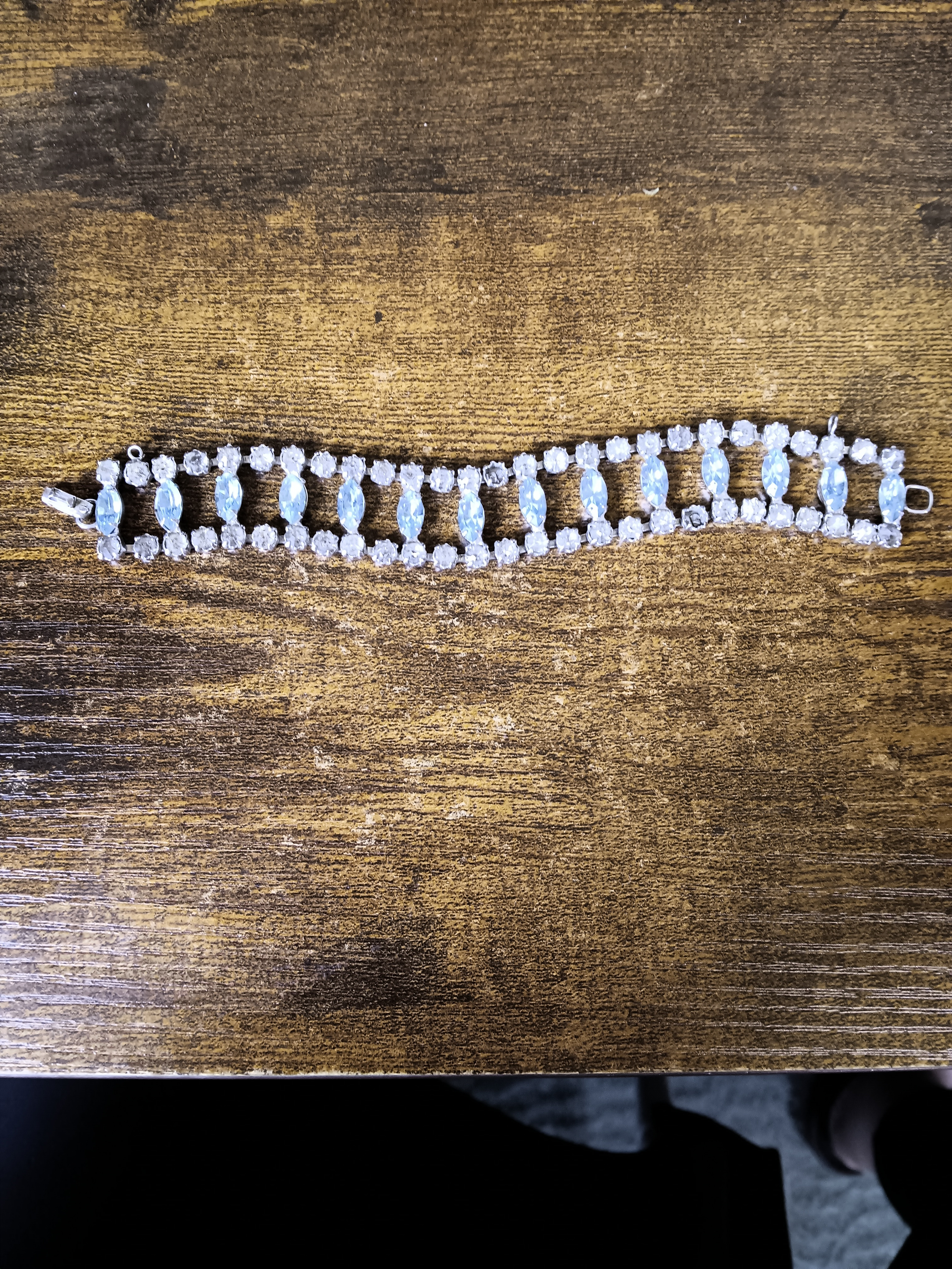 Description costume piece with two rows of rhinestones with oval light blue stone in the middle. Two rhinestones missing (setting hides missing stones) , otherwise complete. Mark on reverse of bracelet, possibly a brand name.
