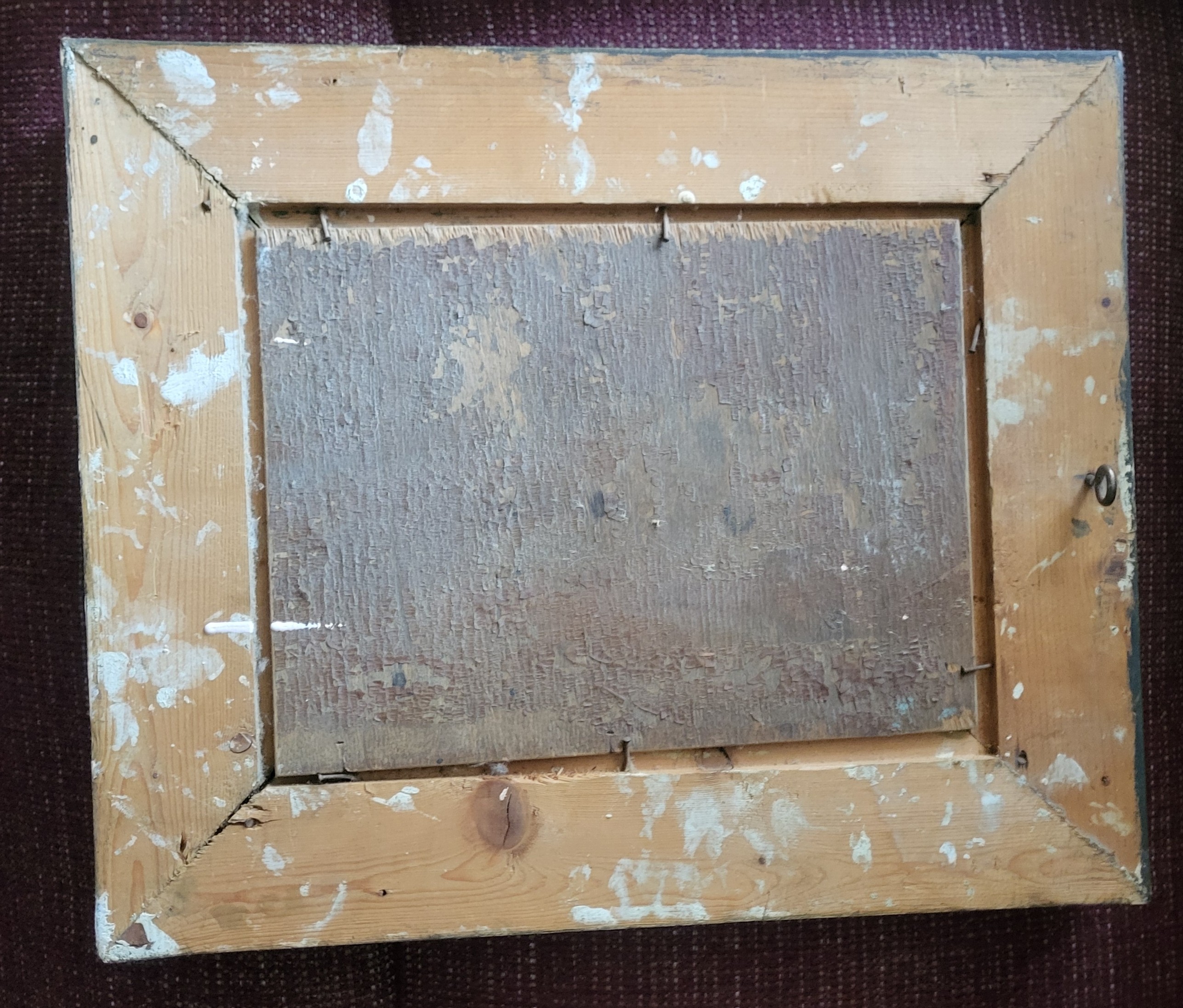 Condition Assessment: The painting is in fair condition, showing signs of age and wear. The frame displays some wear, with minor scratches and discoloration. The painting itself appears to be intact, but there may be some fading of colors due to exposure to light over the years.