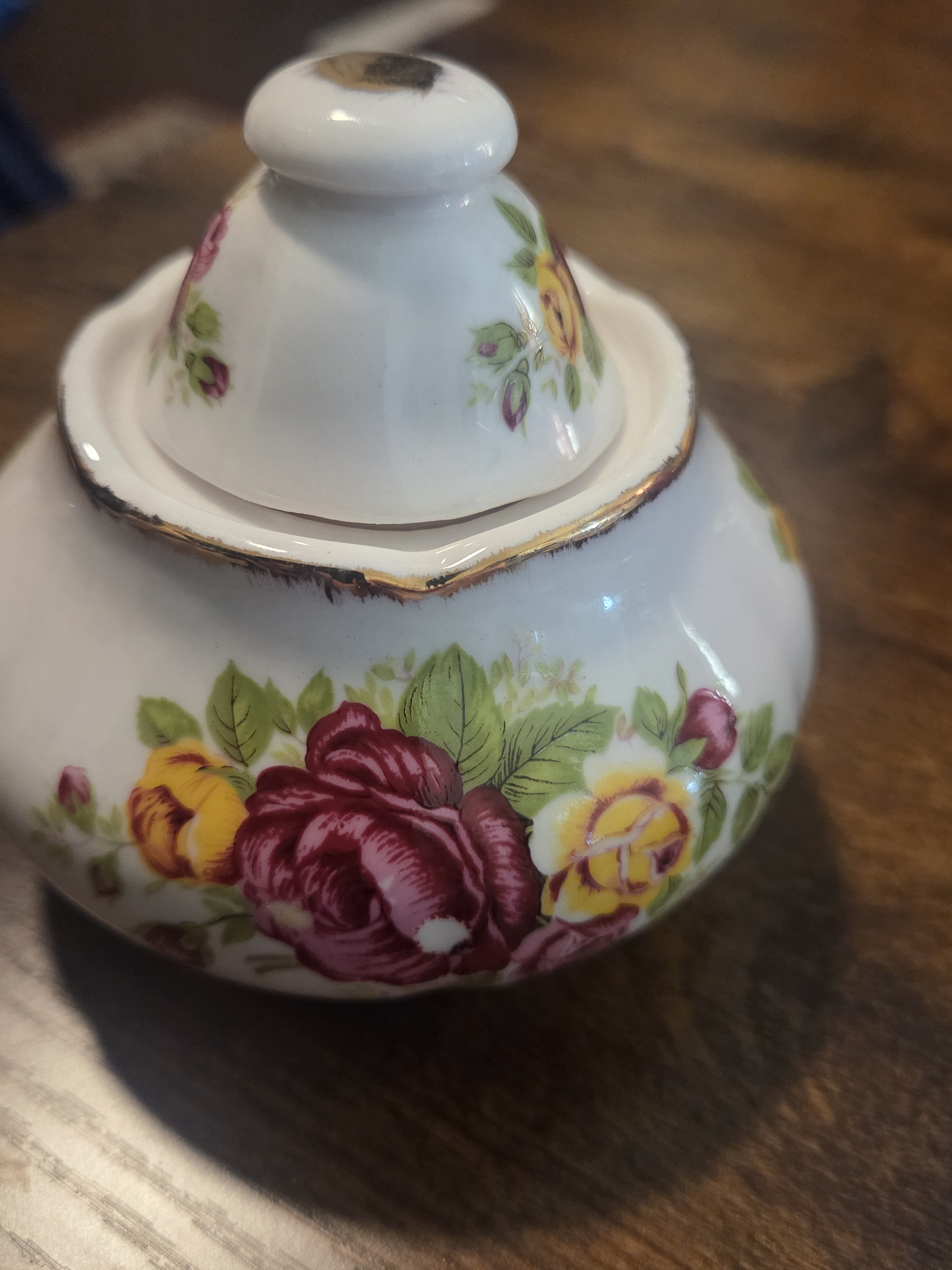 Sugar Bowl with lid. Lid has some gold leaf missing off top knob as expected with decades of use. Small spot of Rose color missing from 1 rose on the side. No cracks or chips.
