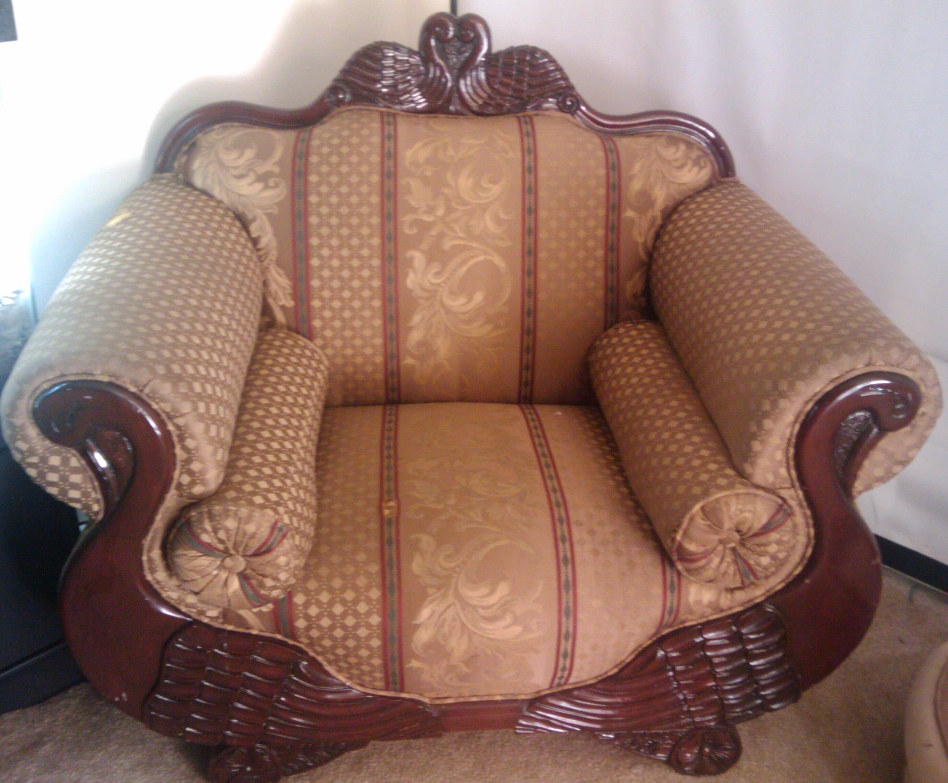 This couch and oversize chair was found at an antique store in Houston, TX and was purchased because of the highly detailed swan carvings in the wood and pinwheels carved into the feet. This couch and chair could use new fabric but the wood is in great shape. Nothing can be found about this couch and chair. Looking to find out more information and maybe an estimated value.