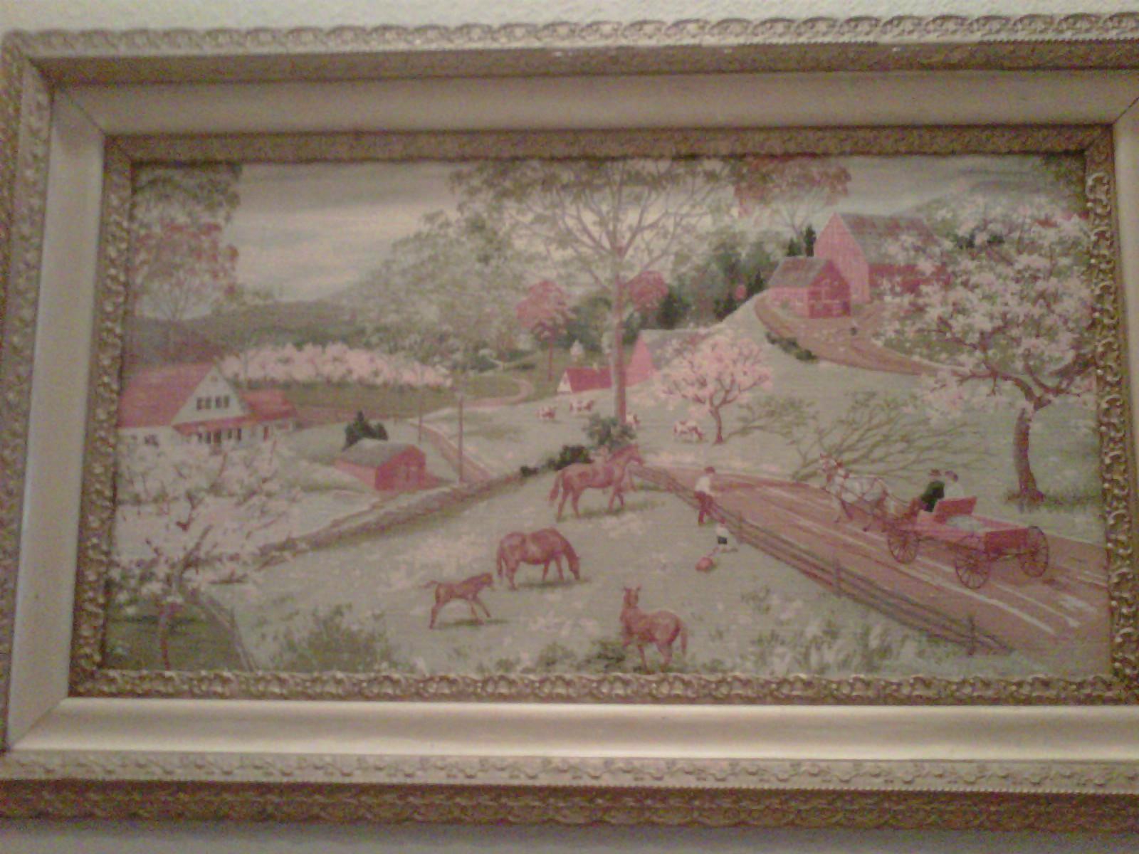 This is a beautiful piece of what appears to be portrait of a country ranch scene made from either textile of some type of fabric. The frames seems as old or older than the actual art work.