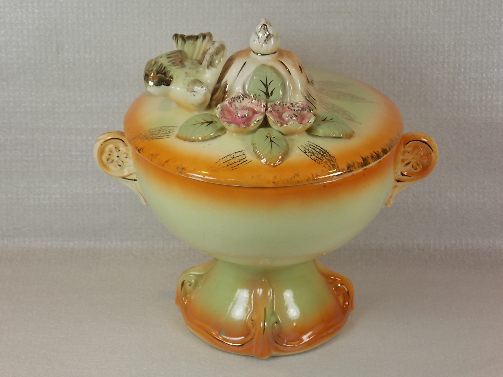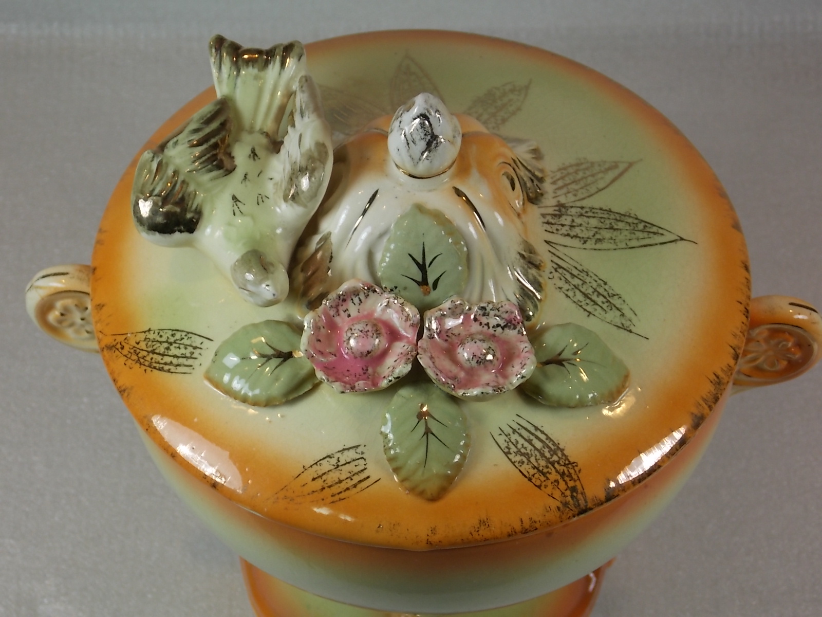 A handled covered pedastal dish, ceramic pottery with gold gilt. The lid has a bird, two flowers and leaves.