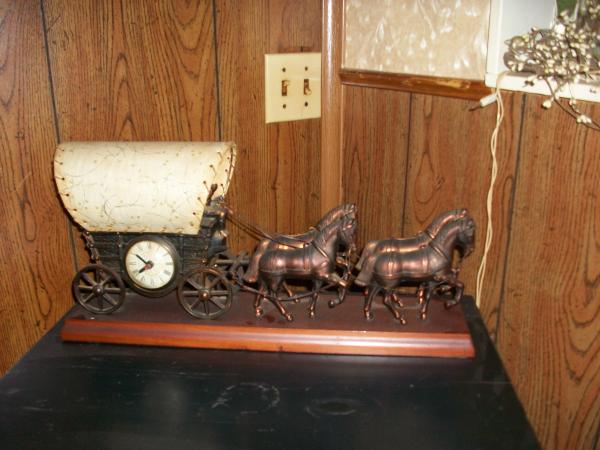 this clock has 4 horses and a covered wagon. a man sitting on it with a whip in his hand. the whip is missing. it also has a light in the covered wagon. clock works and the motion of the hand also is in working order.