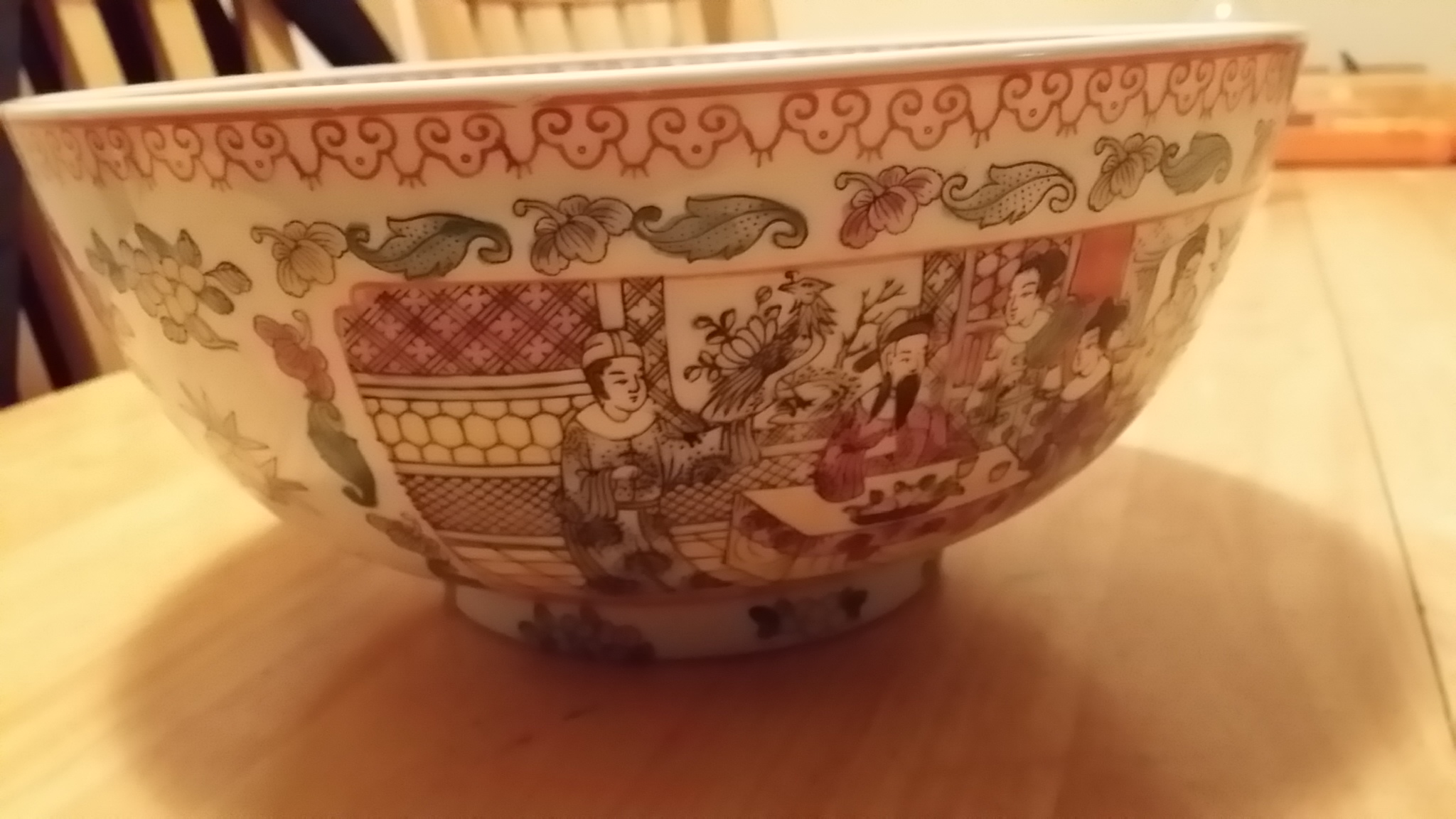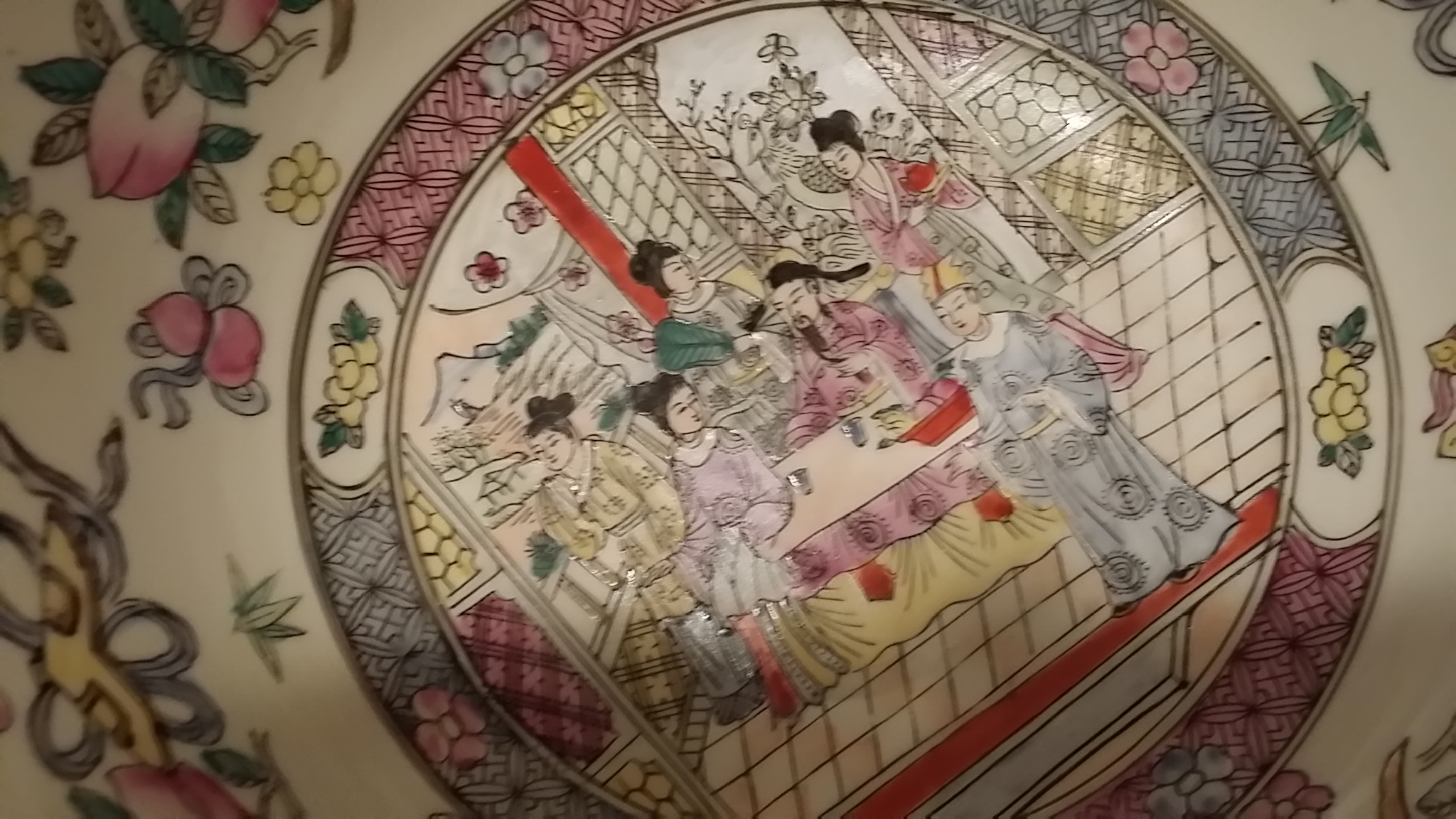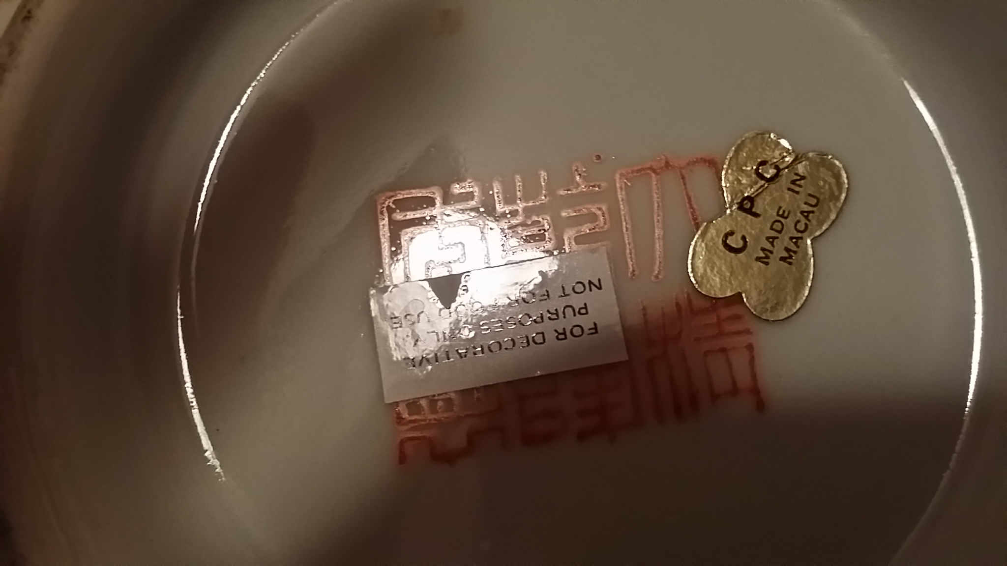 Cpc made in Macau 10 inch bowl says for decorative use only not food sticker on bottom of bowl with gold sticker that says CPC made in macau