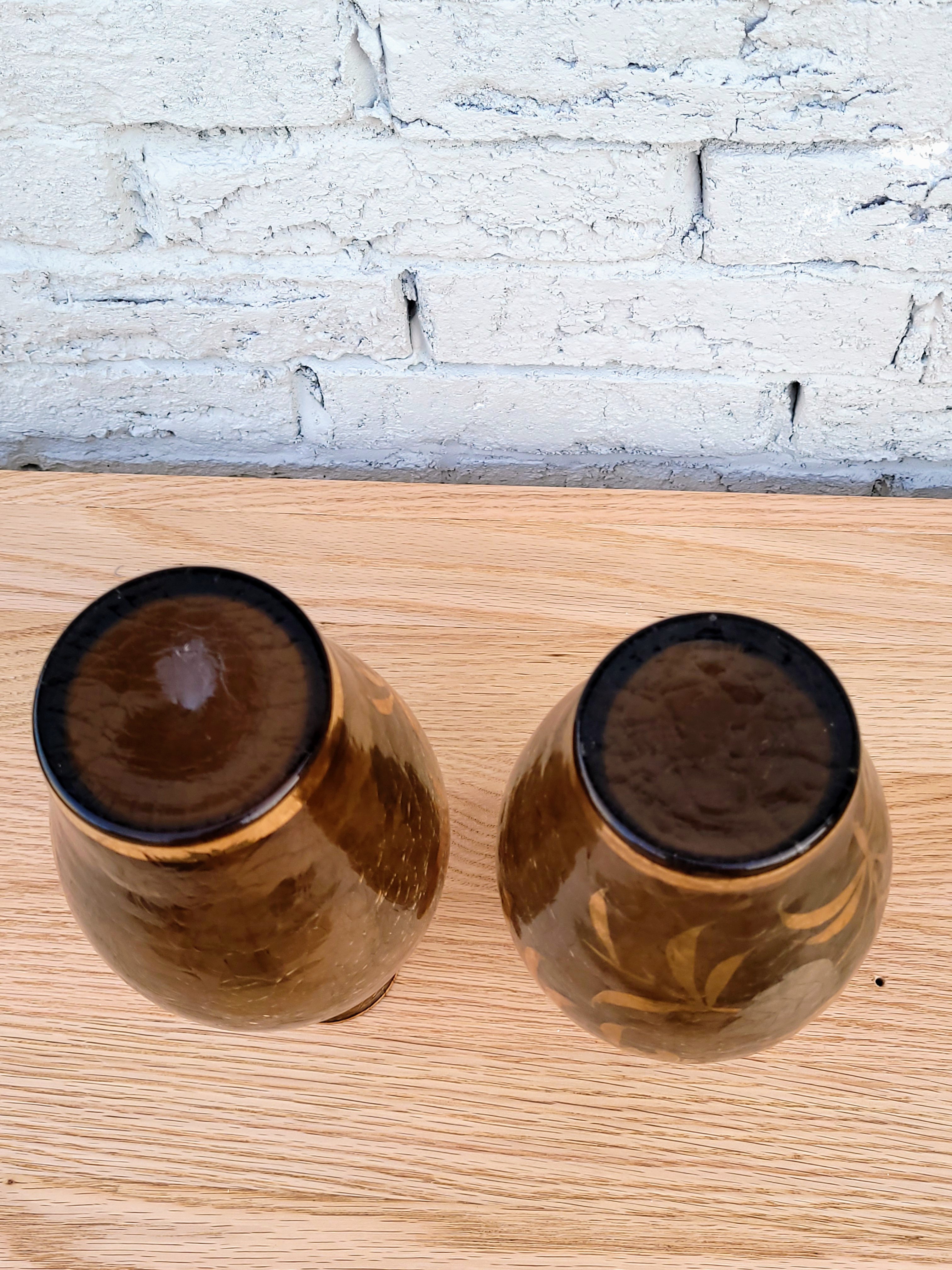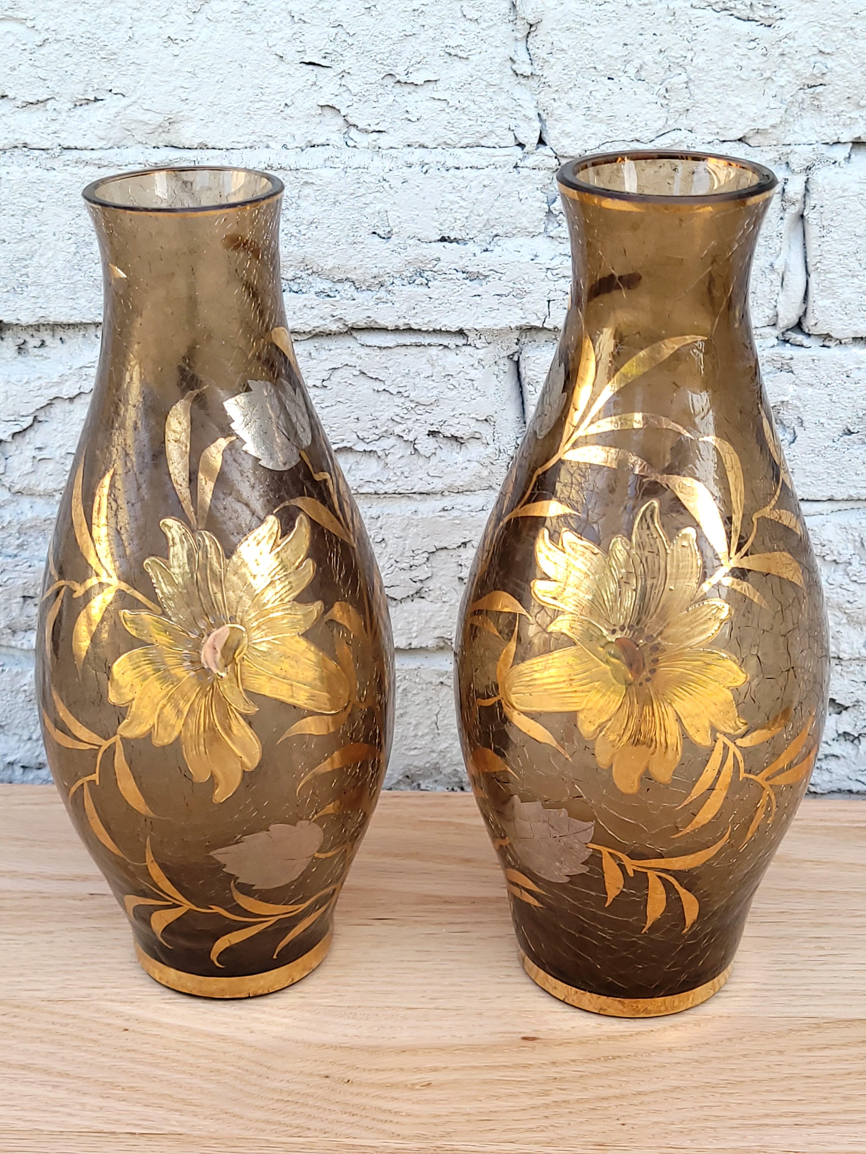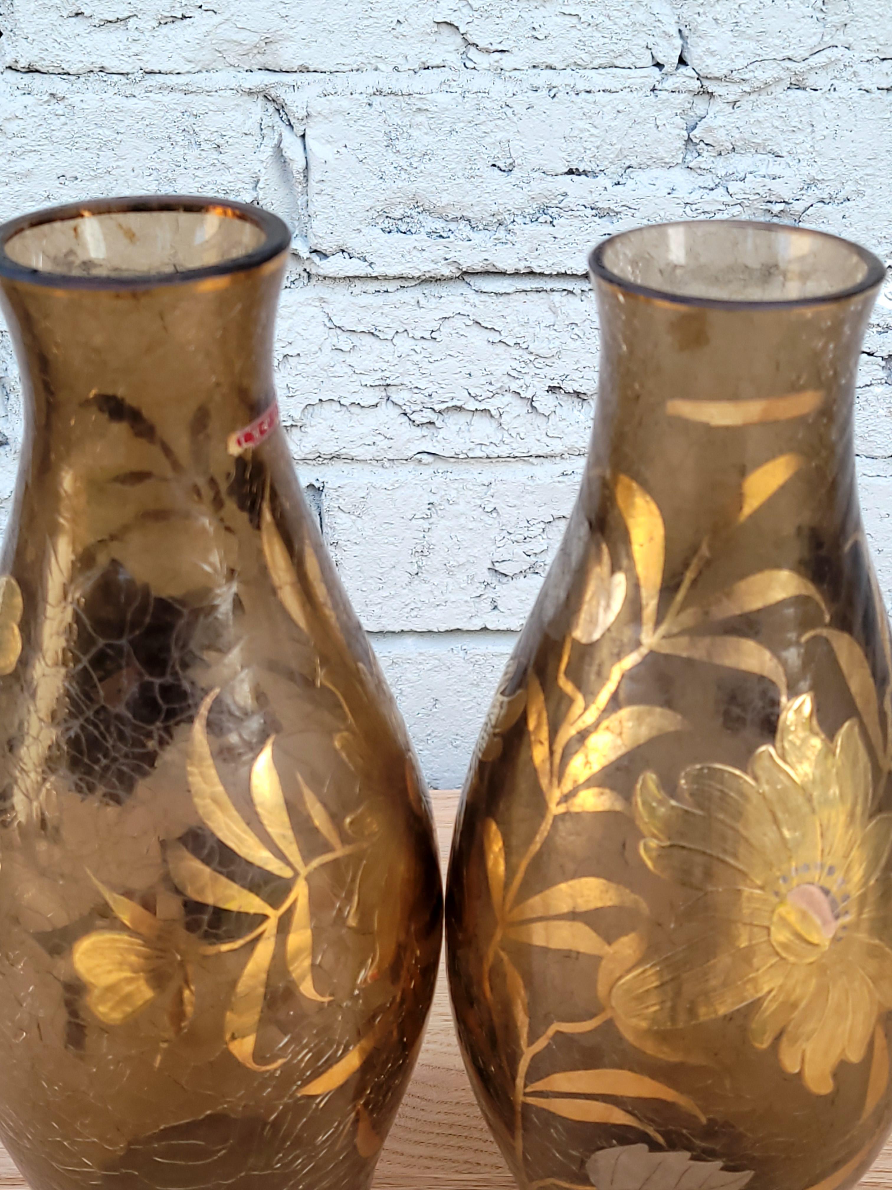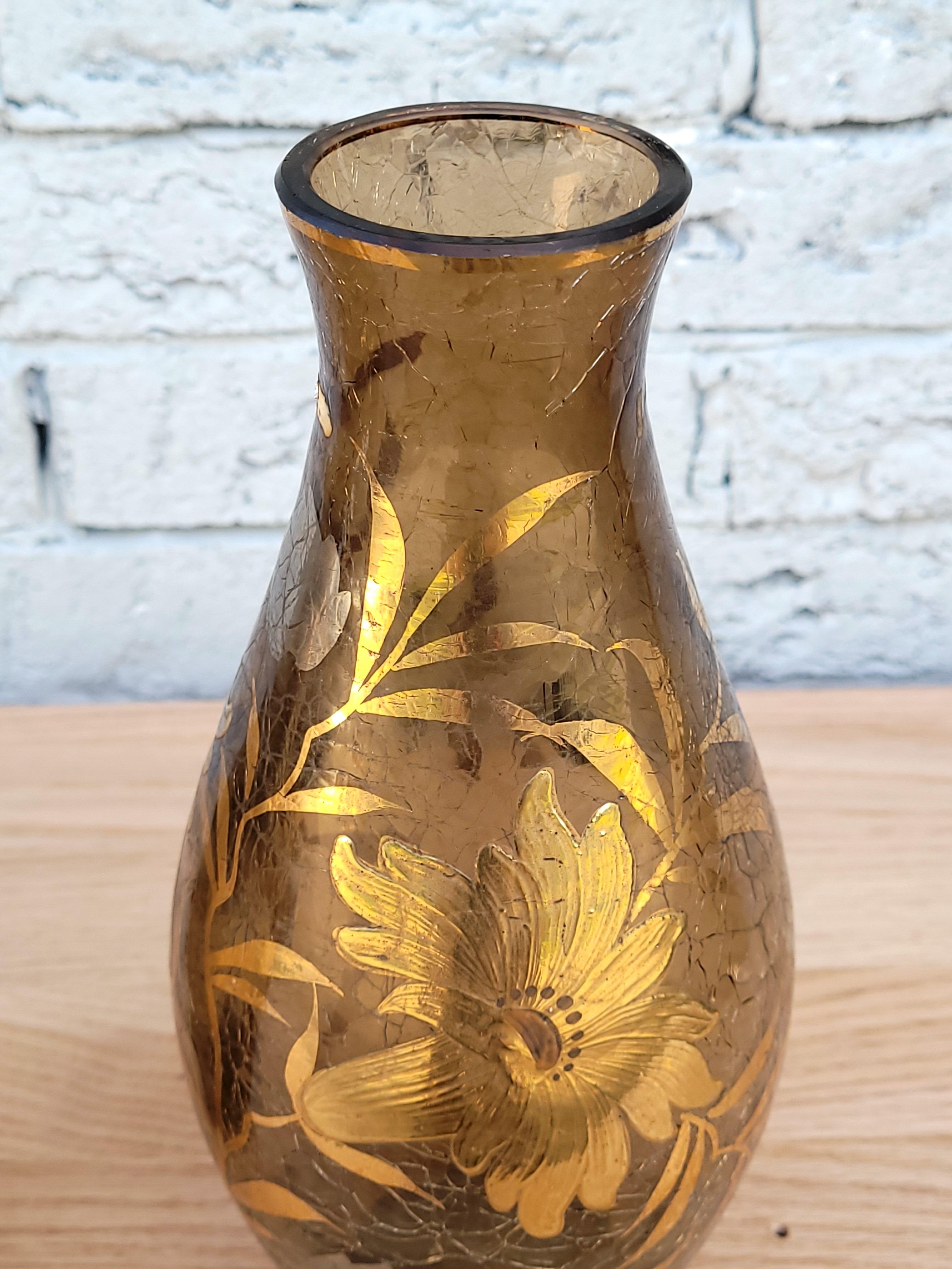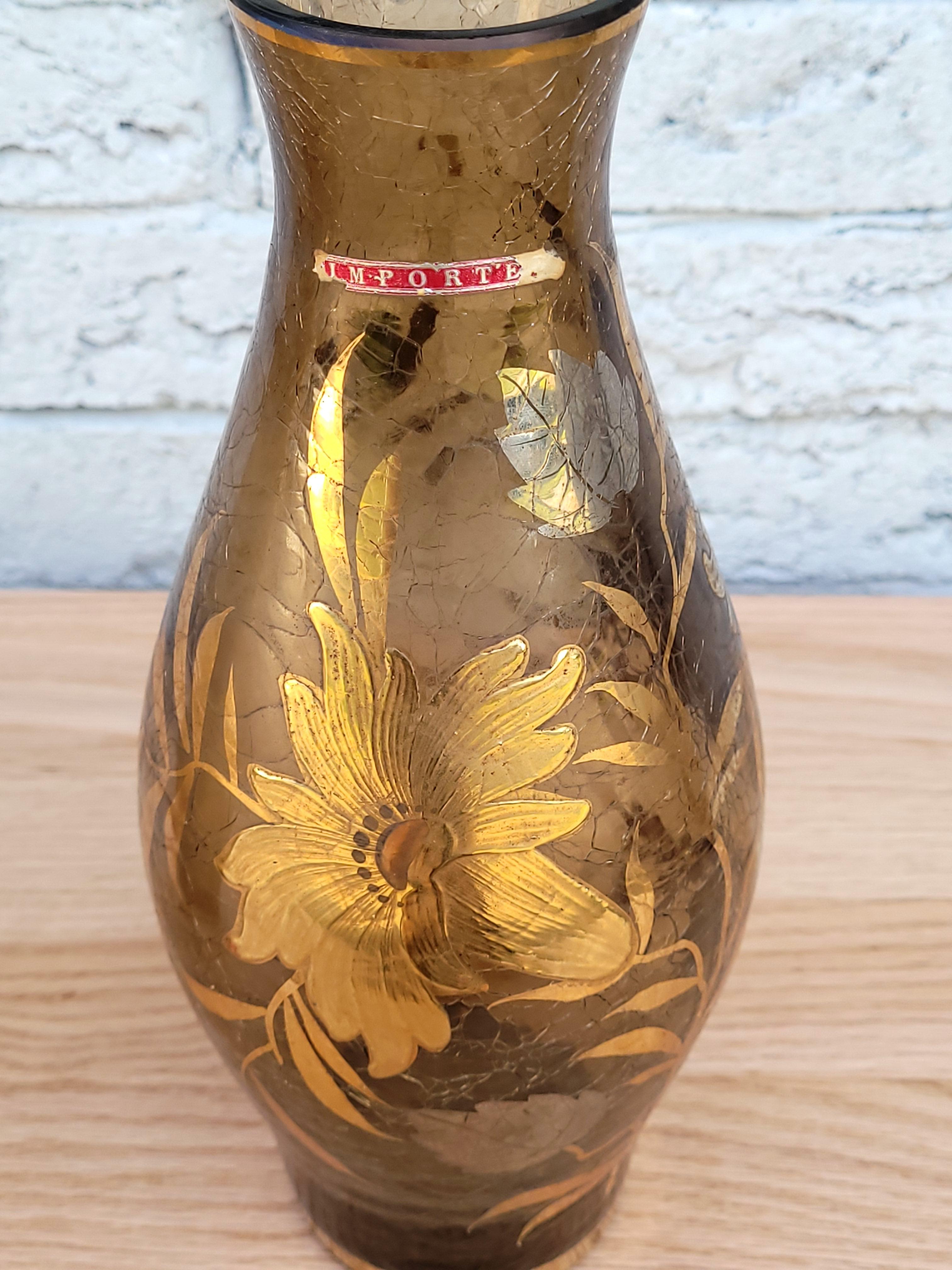 Amber/smoke color with gold floral/botanical detail crackle glass vase with gold rim around top.