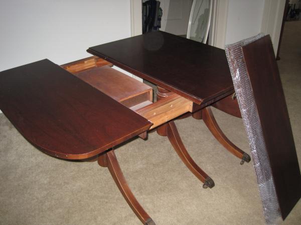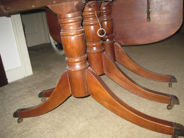 ANTIQUE CRADDOCK FEDERAL STYLE DROP LEAF TABLE with hidden drawer + 2 LEAVES - Craddock stamp is on lid of hidden drawer. Triple Pedestal. With leaves down it is 28" wide and 40" long and with leaves up, it is 64" (each drop leaf is 18" long).. Add the two leaves (13" each) and it is 90" long.
