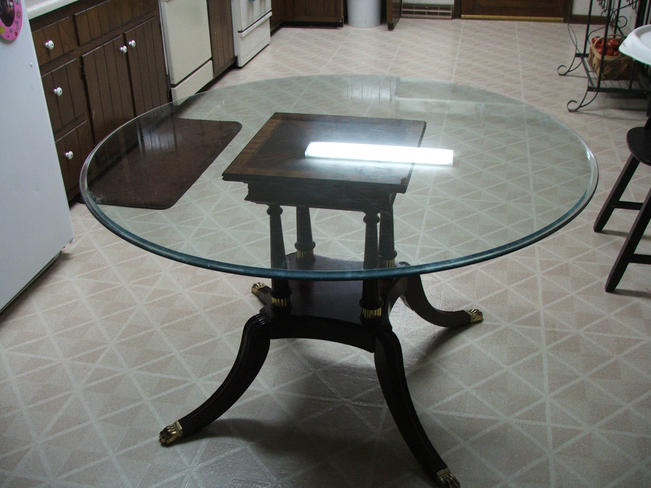 I don't have any information on the company , but with the exception of the glass top it is in the Federal style which was originally popular Circa 1780-1830. Tha table itself is quite modern and not an antique. that said, it is a great looking decorator piece, we sell comparable tables for over $400.00.