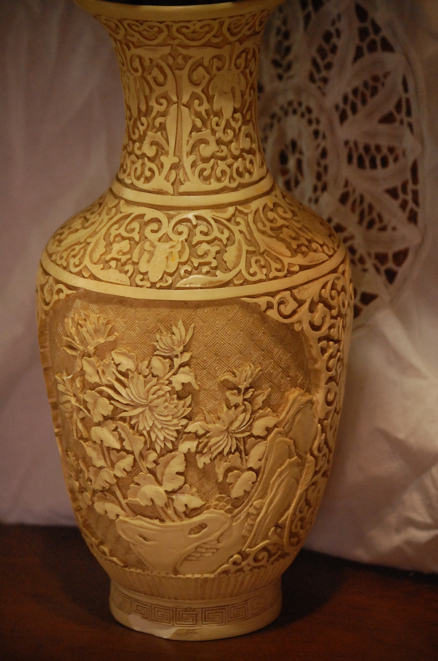 It has carved flowers and mountains or mountainside on both sides one ith incarved bird, a must see I can't explain it to good. will attach photo's