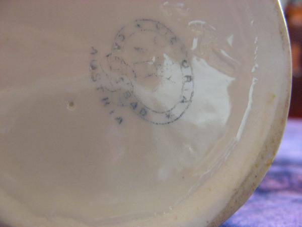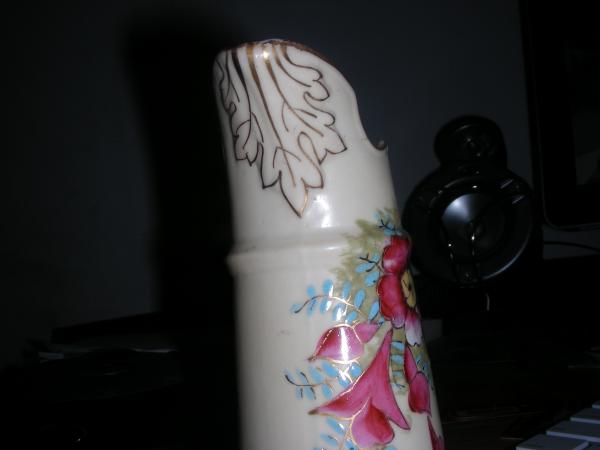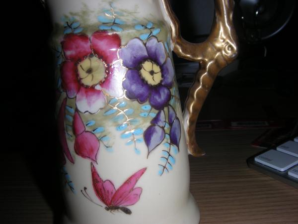 This mini pitcher looks like a creamer to me. It has what looks to be hand painted flower buds in dark pink outlined in gold on one side and pink, purple and blue flowers with a butterfly on the other side. The handle is painted gold and there is a gold leaf pattern on the underside of the spout. There is a small amount of wear away of the paint on the handle. The colors are very vibrant.
