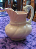 This mini pitcher looks like a creamer to me. It has what looks to be hand painted flower buds in dark pink outlined in gold on one side and pink, purple and blue flowers with a butterfly on the other side. The handle is painted gold and there is a gold leaf pattern on the underside of the spout.  There is a small amount of wear away of the paint on the handle. The colors are very vibrant.