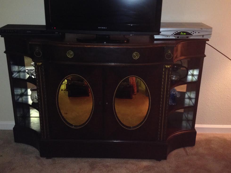 The back of the piece is real wood (not ply wood or card board) but it's not nailed, its screwed (old screws).  It has decorative lion head pulls on the ouside of the drawers and brass drawer pulls.   There are oval, convex mirrors with some yellowing on the front of the cabinet doors - around the mirrors are brass tacks (I assume hand placed since they are not uniform around the edges).  The original skeleton key is with the piece so the cabinet doors lock.  You insert the key in the right side  to open the right door (left side has a false key hole decoration) the left door opens by pushing on a release at the top back of the door.  The bottom of the piece is supported by 8 wooden legs (no plastic or metal on the bottom) - 4 in front / 4 in back.  The top of the piece is in-layed with what I only assume is leather and gold leaf.