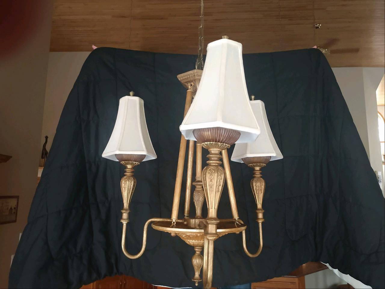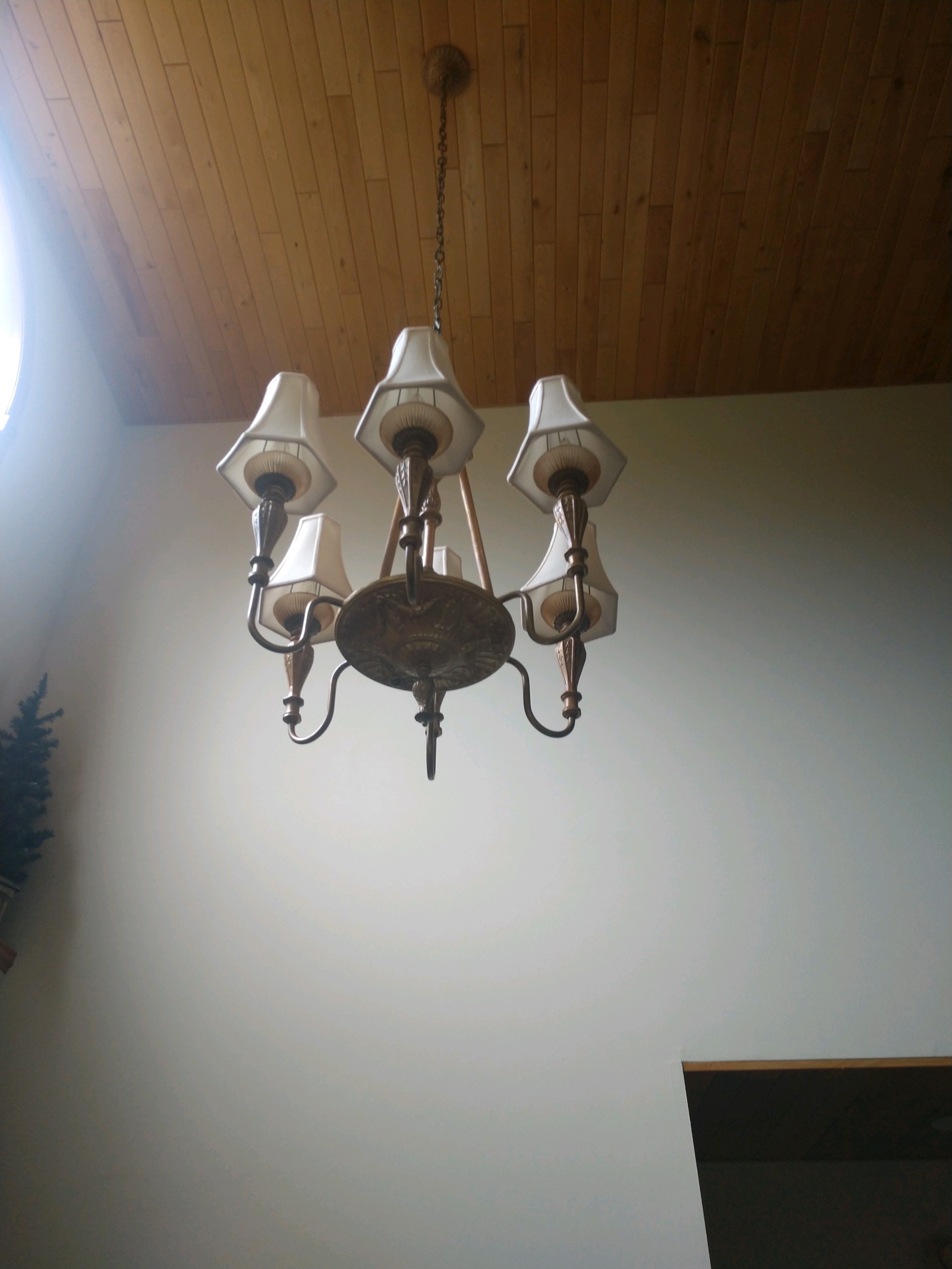 6 light chandelier,  Gold,  Made by Crescent Brass Reading PA.   Has a 3 light chandelier mate also.  Both are about 25 years old.  31" x 30"  and 27" x 27"   Both are in excellent condition and come on 4' and 6' chains.  All wiring attached.