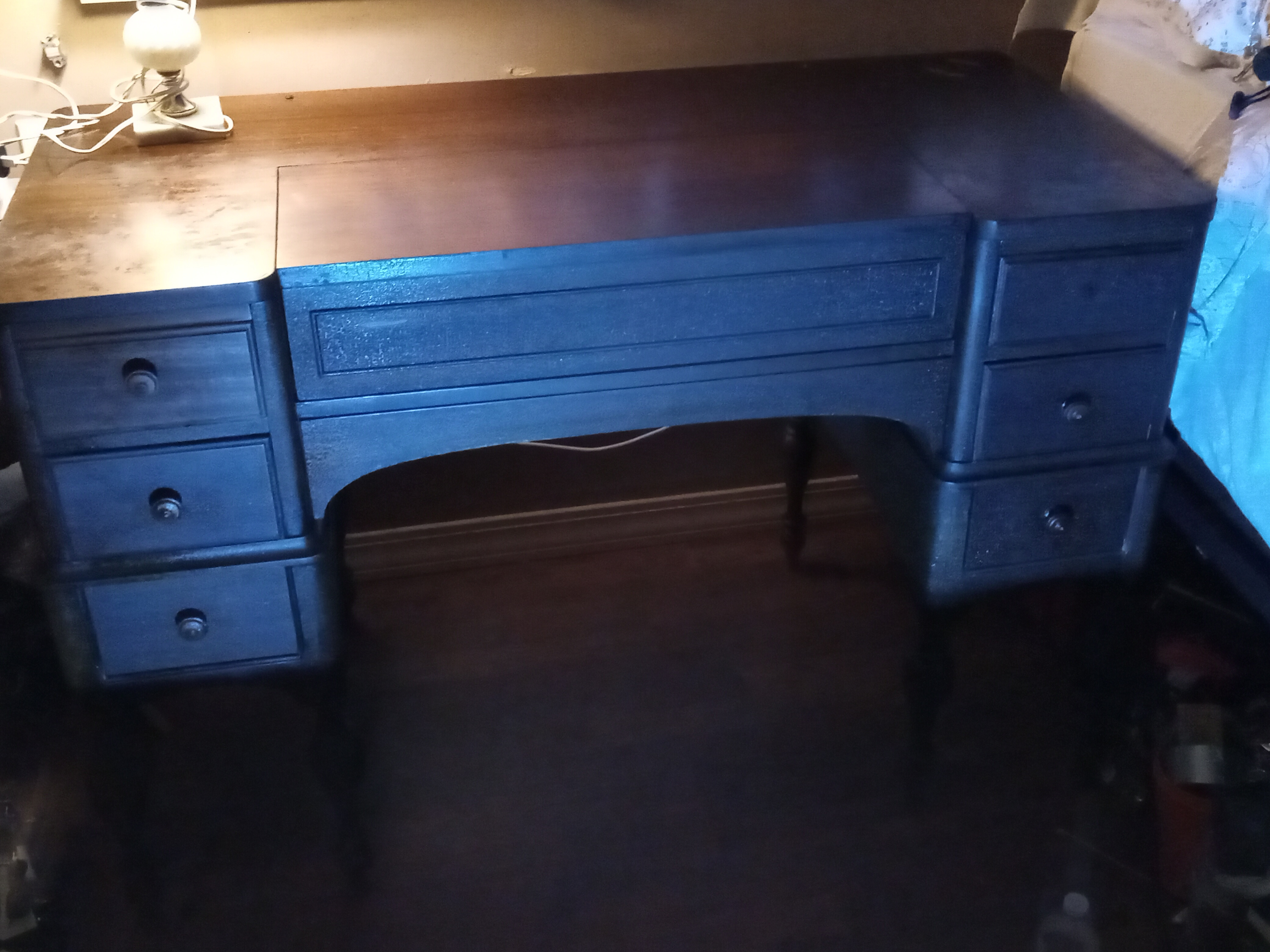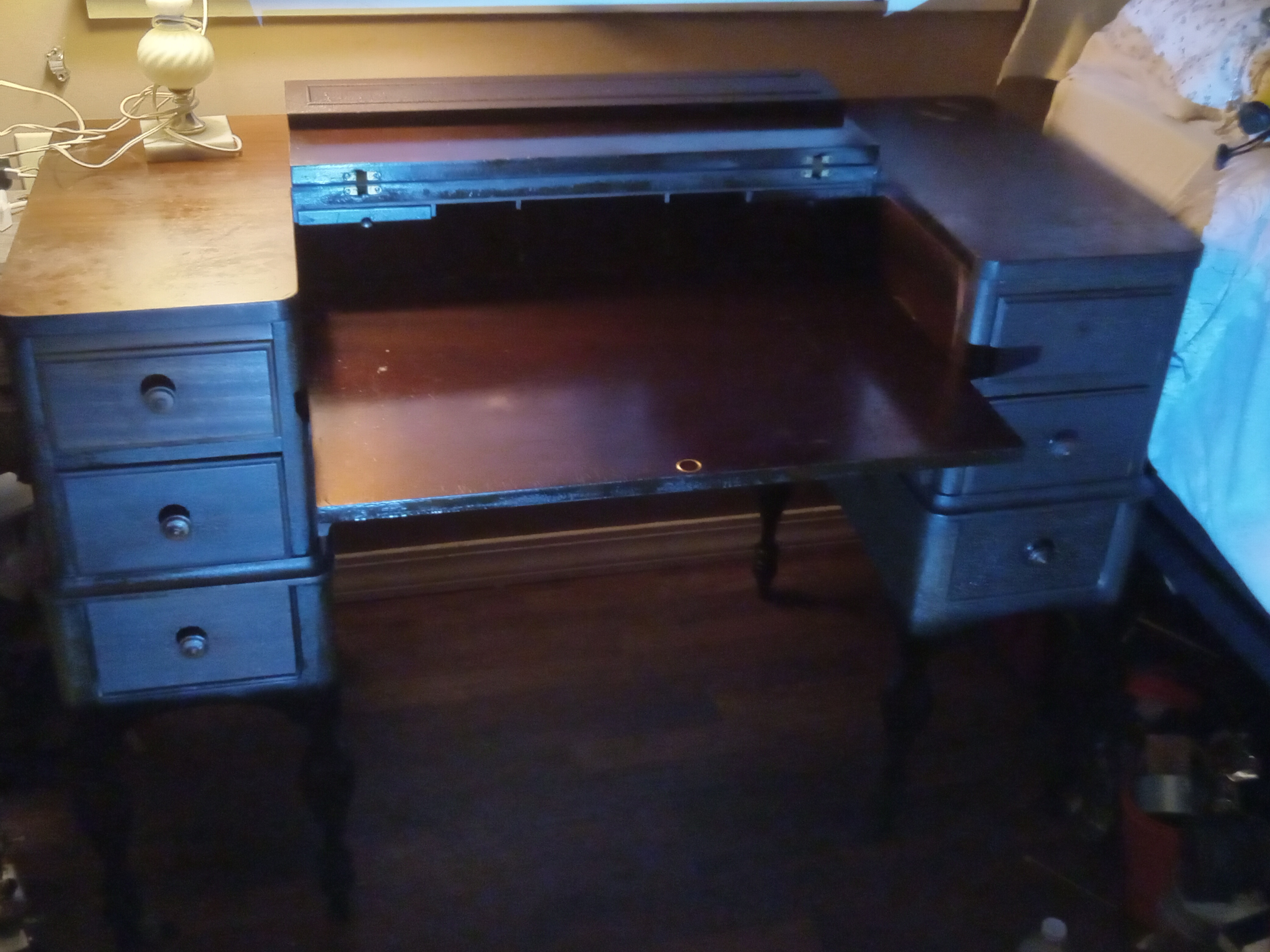 Drop.down front..pull out writing table..6 drawers..3 on each side..pull out center ing table is 3 open face compartments with 2 small drawers on each side ..it has the numbers 1264 and 623 stamped and written in several places..no further information knpwn..I appreciate any info you can provide me for thos item..thanks