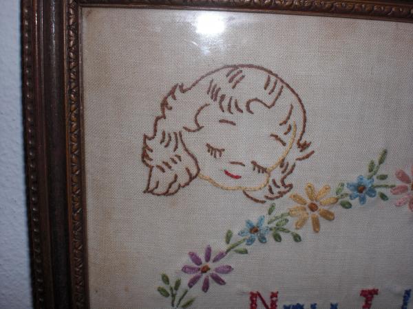 material, cross stitched, framed