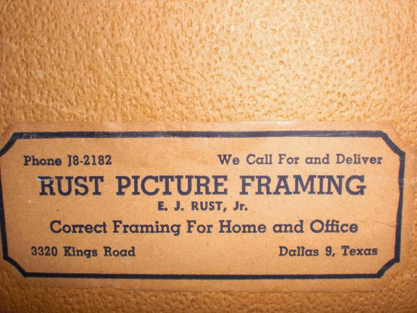 no signature; frame label on back states phone J8-2182 Dallas 9, Texas by Rust Picture Framing; E J Rust Jr. 3320 Kings Road