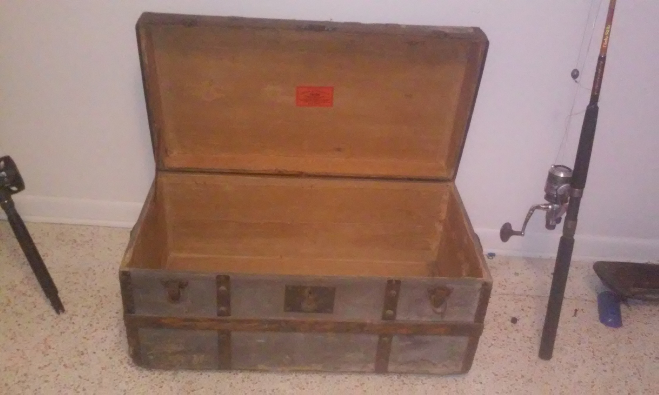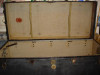 16X18X34 are the measurements from the outside. Looks to be covered in a blue material. Haven't seen another one yet. Would love to know more about it. Condition is worn as far as the fabric goes, but inside is beautiful. Bare wood inside. Thanks on any info in advance.
