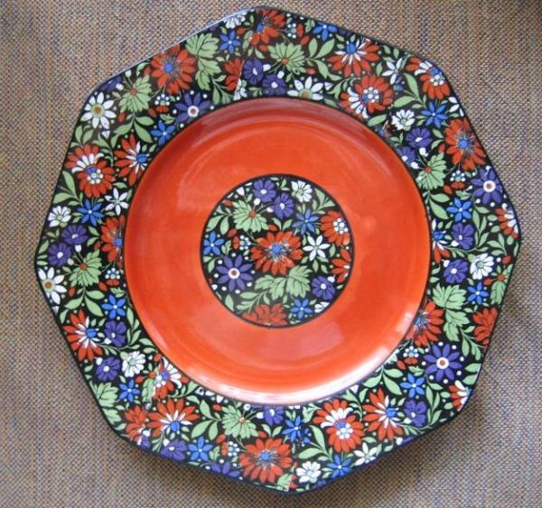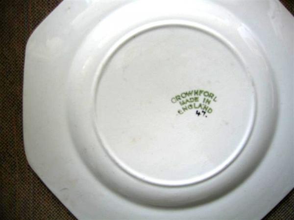 Crownford tea set: 6 cups/saucers/small plates. Teapot and lid. Creamer. Sugar. Tip of teapot spout was broken and has been well repaired. One of the plates has a 1 inch diameter (or so) defective finish area where the red-orange does not cover the white color underneath. I have been unable to find this pattern or its history. I AM interested in the approx. value of the set. Except for the spout, the condition seems like new - no other chips, etc.