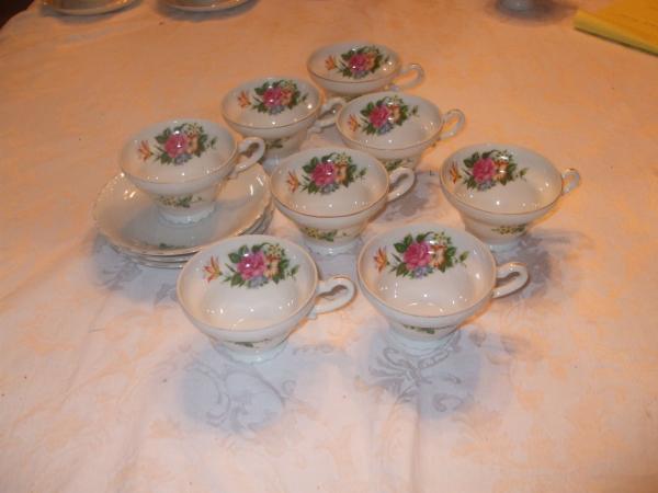 white with yellow flowers on outside, rose medley inside. scalloped bottom, silver edge. 8 cups and 3 saucers. No chips