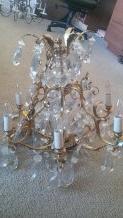 The chandelier is 24 tall by 24 wide. Very heavy, brass fixture with hanging crystals and crystal hurricane shades in the center. The lamp is stamped "made in spain". I have several of various sizes that all have brass and crystal and are stamped the same.