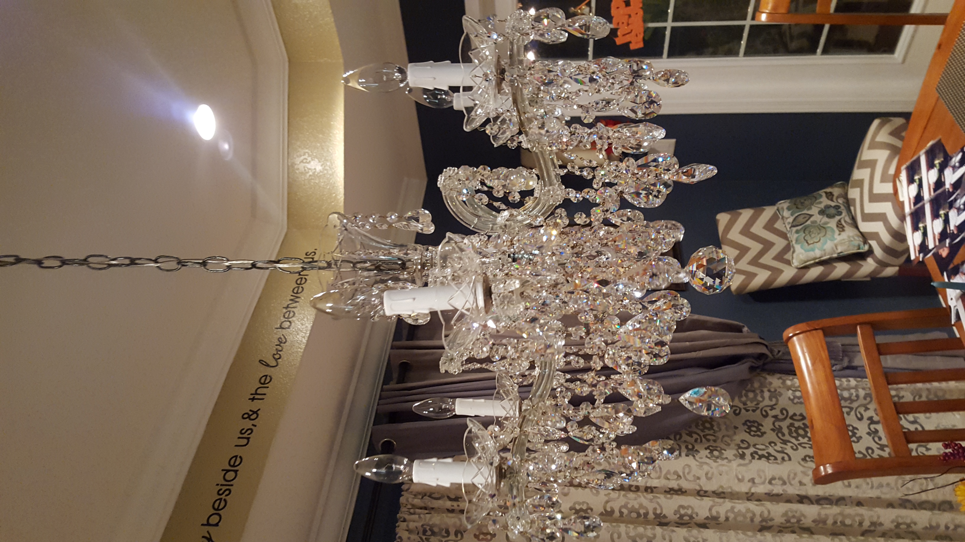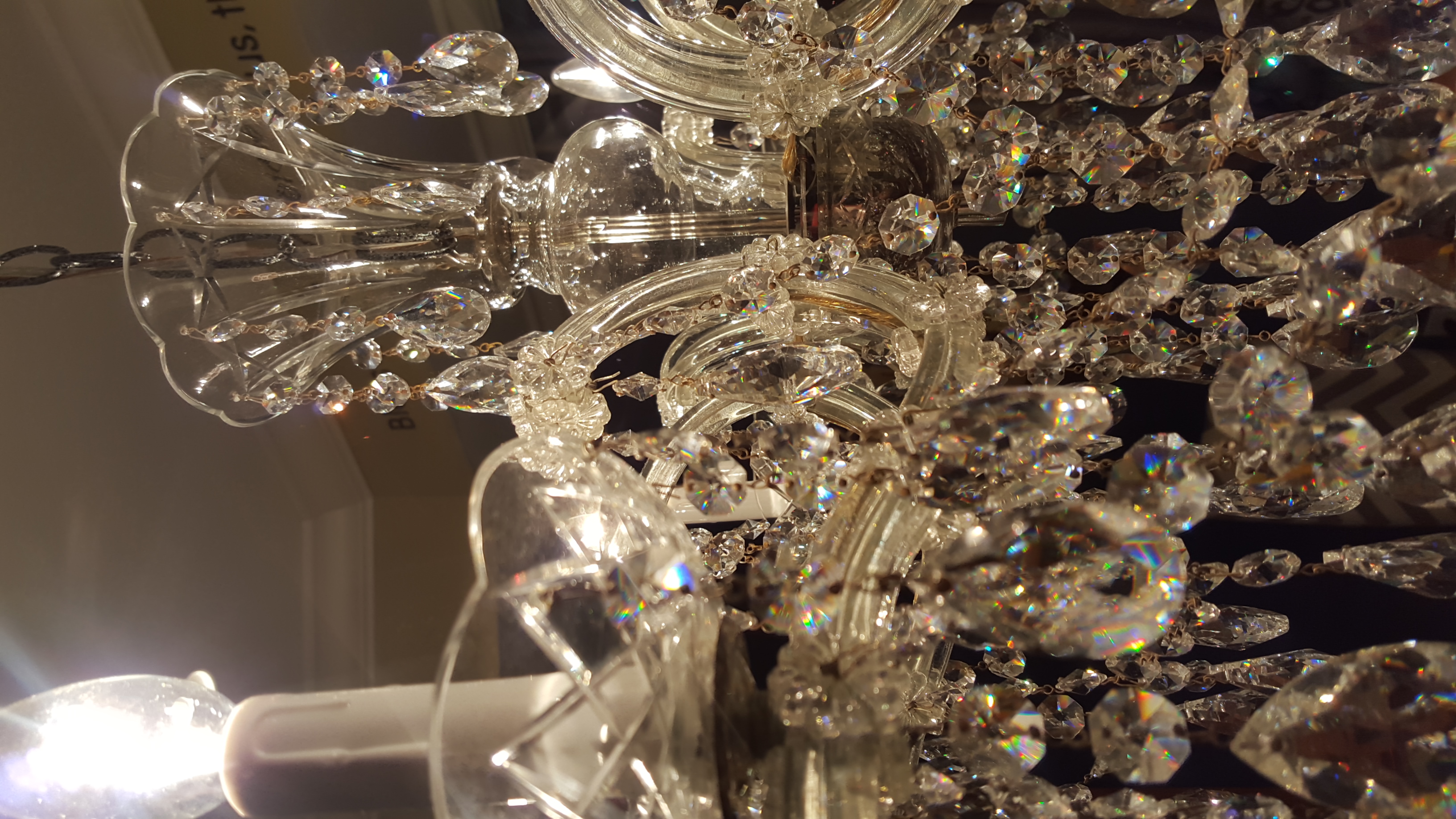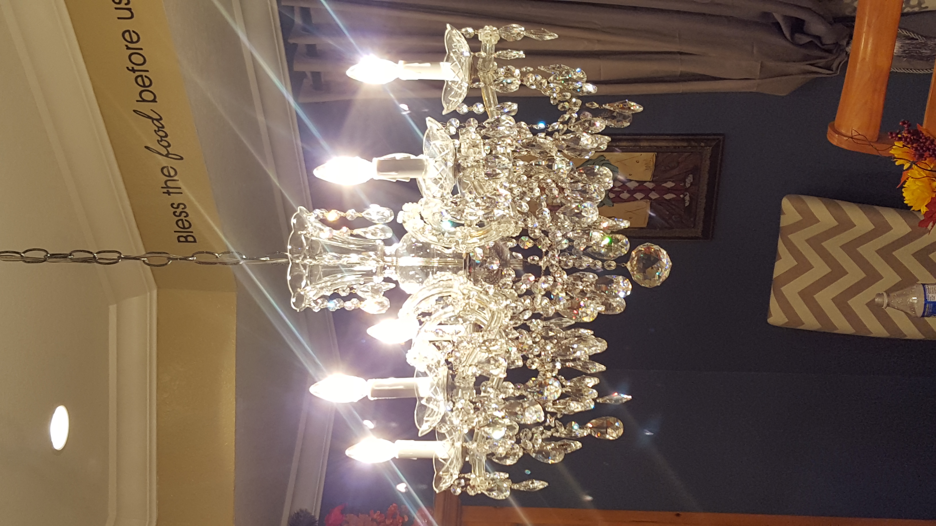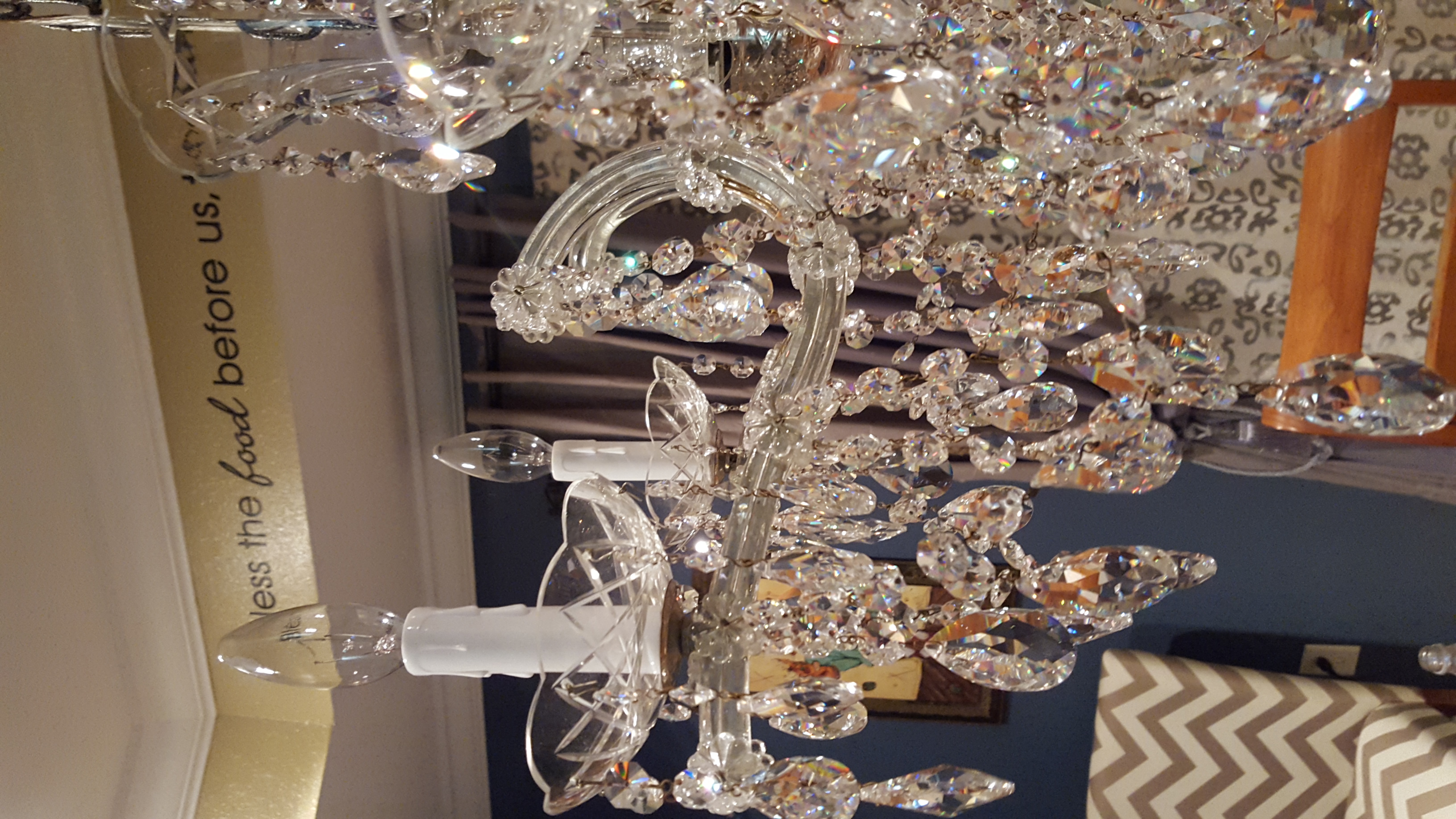I am unaware of the age, the lady I purchased from told me she and her husband were living in Germany between 1969 1970. They purchased the chandlier from a friend. There are no markings that I can find. Their are little daisy's on all the arm stems which are encased in glass. There are 6 arms, each have 3 strains of crystals between them. A crystal vase with thumb size endention around the bottom and a tulip vase with 10 hanging stains of crystals incase the center housing which appears to be stainless steels. There are 6 candelabra crystal bowls with a criss cross pattern that each have 8 stains of crystals. Underneath the center stem is a crystal shape bowl that covers the base which has 6 long stains and 1 center stain with a .75lb solid crystal ball. It is a stunning chandlier. I've searched for days and examined many online images but no luck. I like to know if anyone can tell me the approx age, make and name and even a estimated value. I extend to keep as a family heirloom.