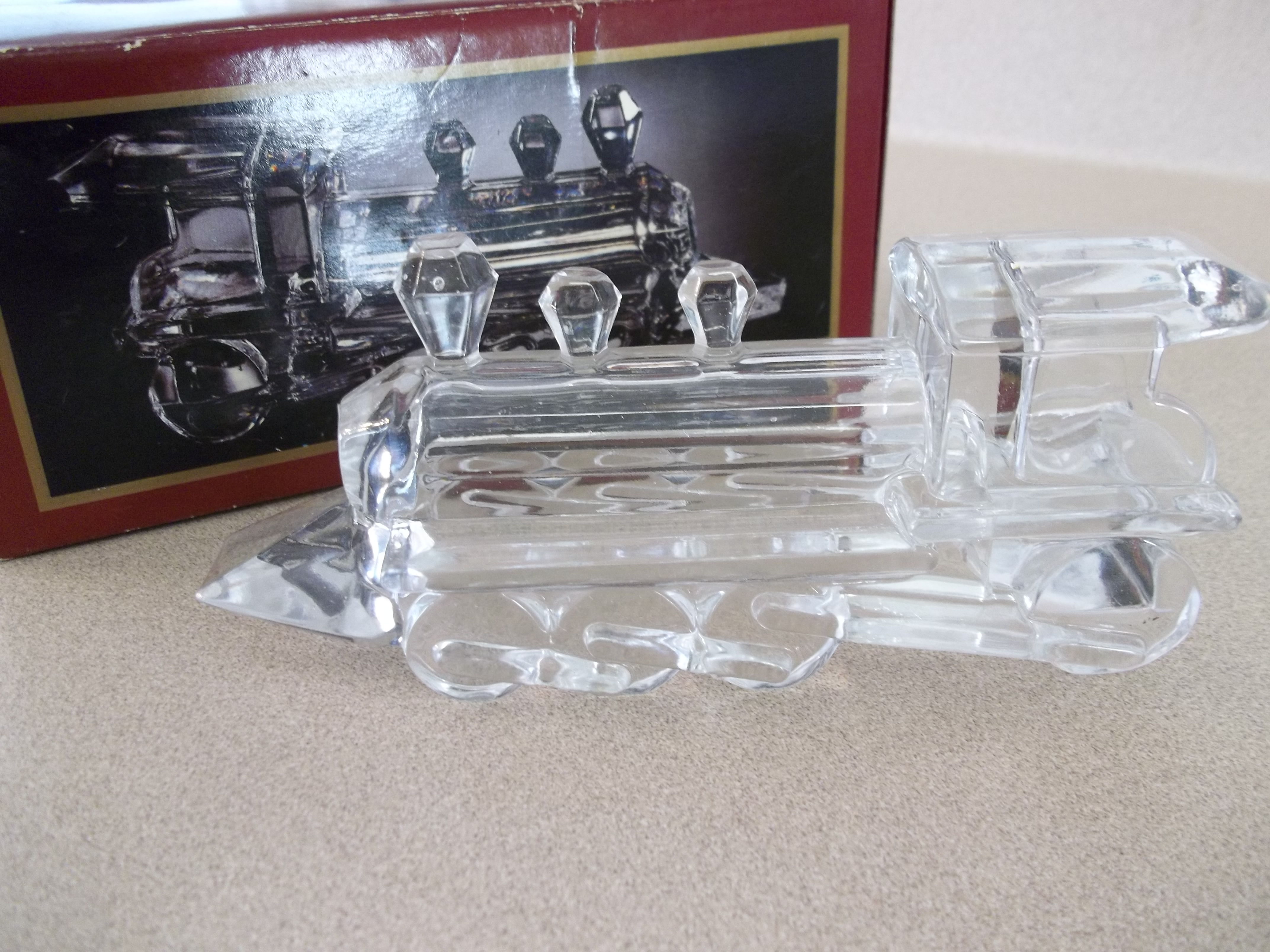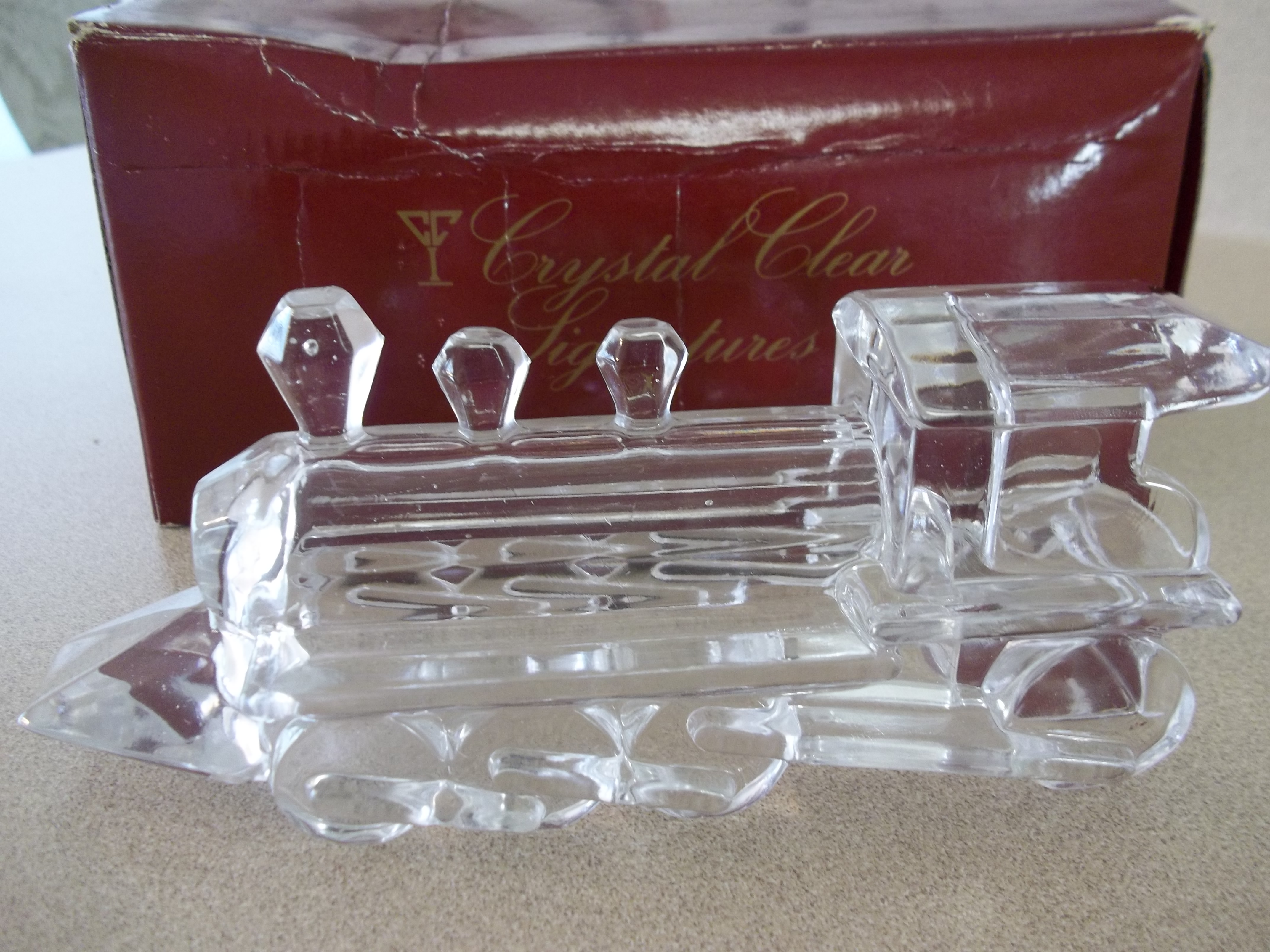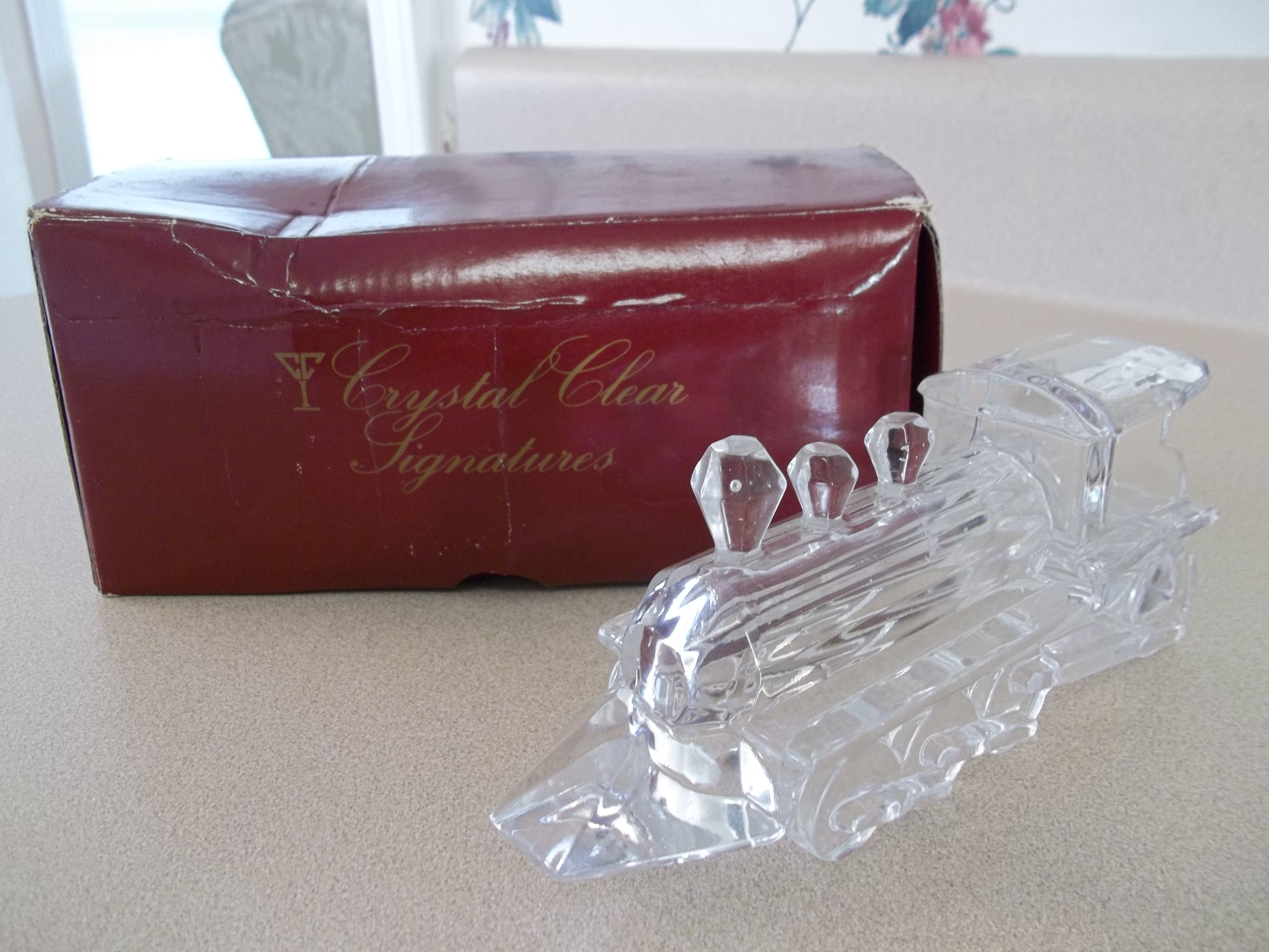This is a Crystal Clear Industries Signatures Train Figurine made in Italy. The Style Number is 532114-GB. The crystal train is 24% lead crystal which was made by Crystal Industries in Italy. The circa is unknown. I'm guessing 1950s-1970s.. I inherited the Crystal Clear Industries train from my late brother. He purchased the vintage crystal train in 1997 from an estate auction in Mountain Brook Alabama. I have not been able to locate another one on the Internet for price comparison. There are no backstamps or markings on the crystal train. i have the original box which lists the style number 532114-GB and the manufacturer. The dimension of the train is 5 1/2" x 2 1/4". On the right front side of crystal train there appear to be a visible scratch mark. Please examine pictures for closer inspection. The close-up photographs revealed that it is not a scratch mark but a line of several bubbles in the glass. As a matter of fact there are several bubbles in the glass crystal. other than bubbles and the appearance of a scratch, the crystal train is in good condition. Hopefully the bubbles won't hurt the evaluation. The crystal train weighs 13.53 ounces.