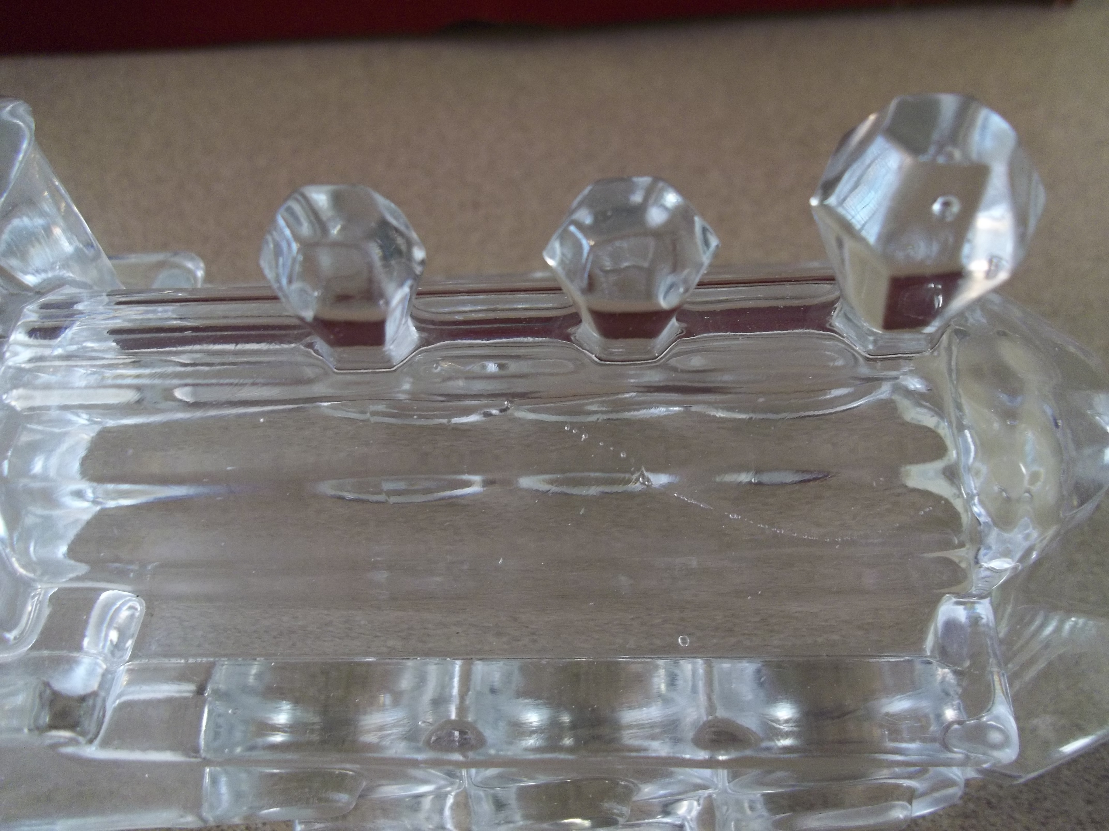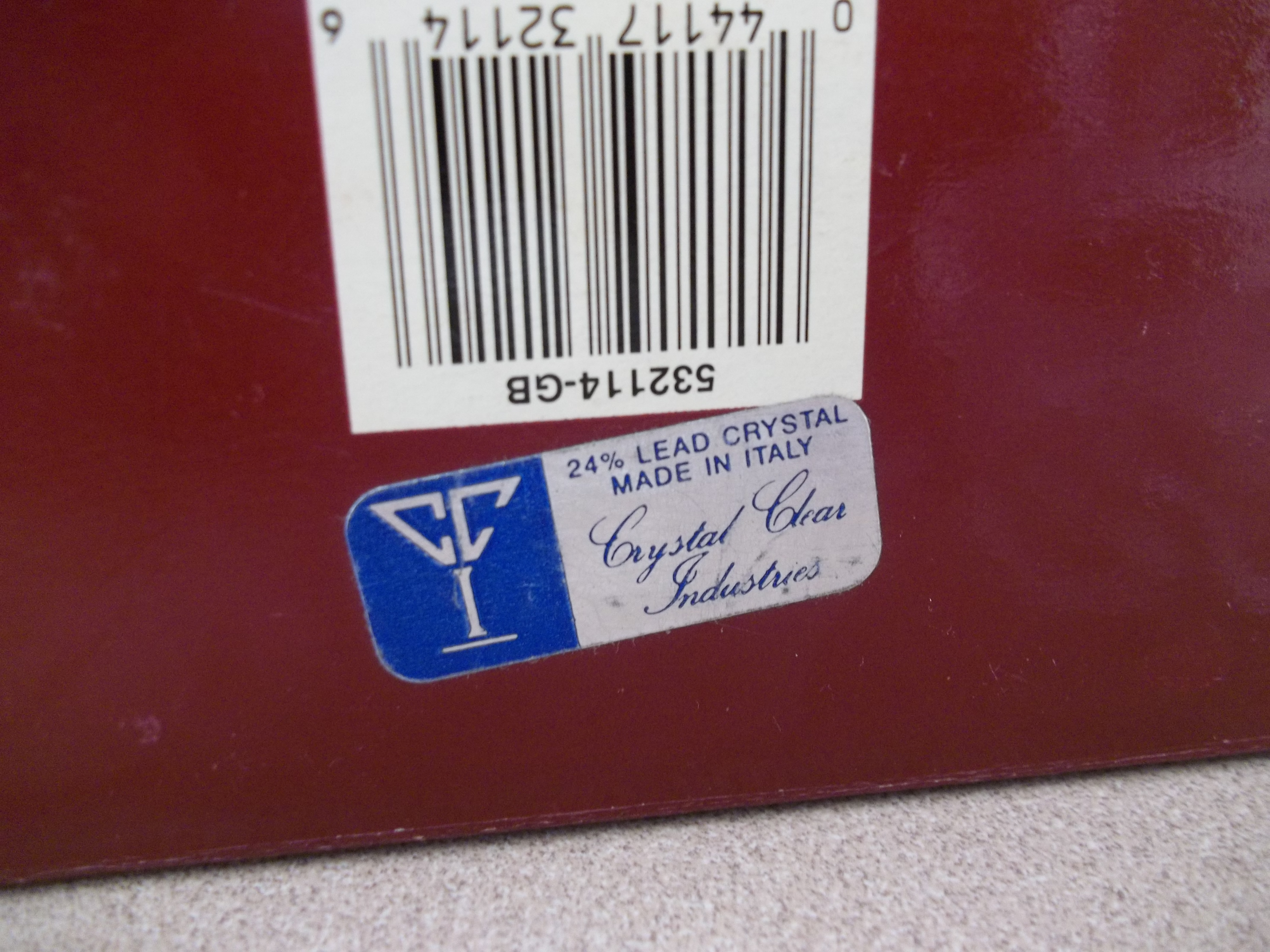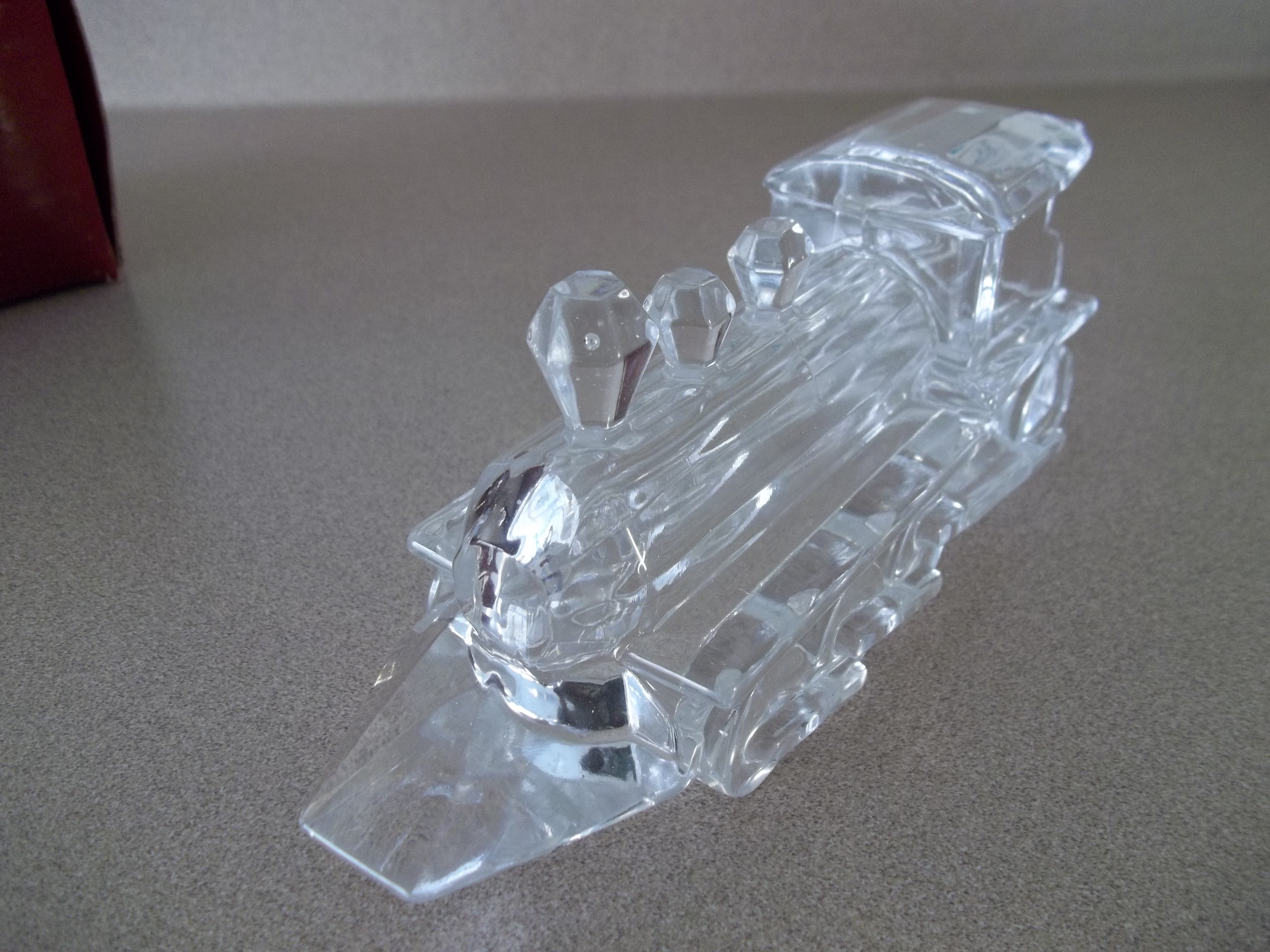 This is a Crystal Clear Industries Signatures Train Figurine made in Italy. The Style Number is 532114-GB. The crystal train is 24% lead crystal which was made by Crystal Industries in Italy. The circa is unknown. I'm guessing 1950s-1970s.. I inherited the Crystal Clear Industries train from my late brother. He purchased the vintage crystal train in 1997 from an estate auction in Mountain Brook Alabama. I have not been able to locate another one on the Internet for price comparison. There are no backstamps or markings on the crystal train. i have the original box which lists the style number 532114-GB and the manufacturer. The dimension of the train is 5 1/2" x 2 1/4". On the right front side of crystal train there appear to be a visible scratch mark. Please examine pictures for closer inspection. The close-up photographs revealed that it is not a scratch mark but a line of several bubbles in the glass. As a matter of fact there are several bubbles in the glass crystal. other than bubbles and the appearance of a scratch, the crystal train is in good condition. Hopefully the bubbles won't hurt the evaluation. The crystal train weighs 13.53 ounces.