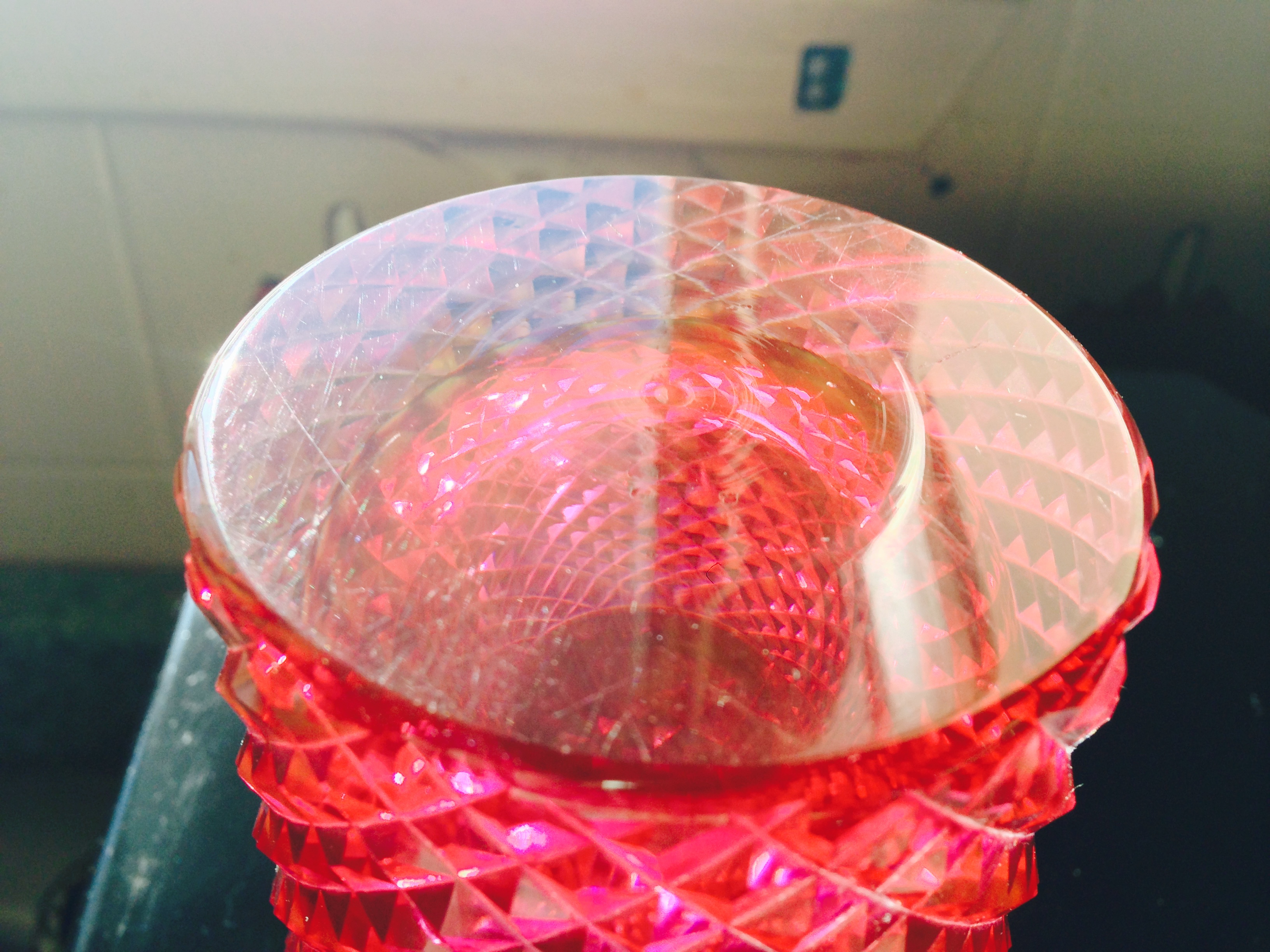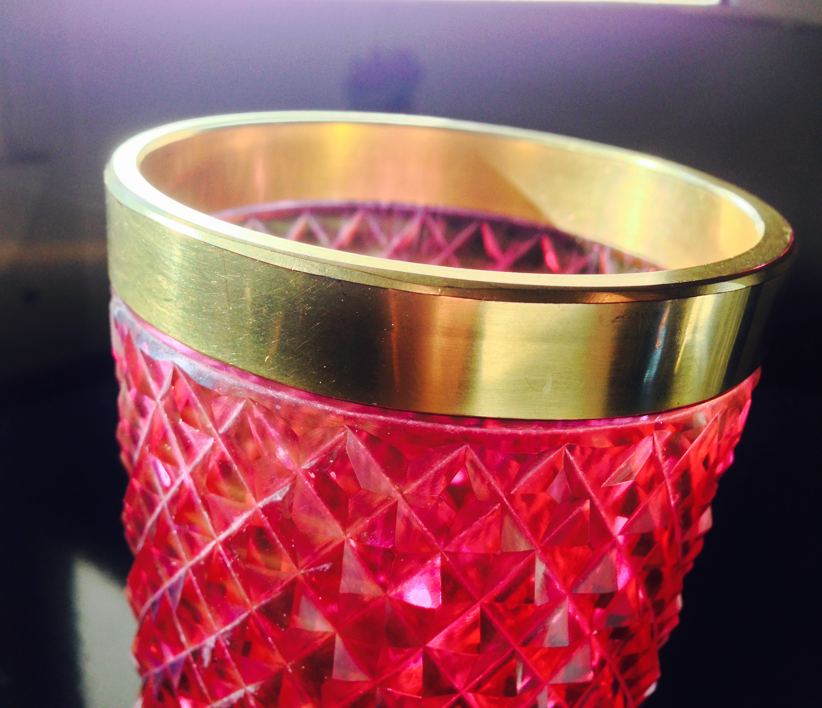 This is a clear crystal glass with a ruby colored insert and a bronze or brass rim. I was told that it could be a Baccarat though it is not marked.