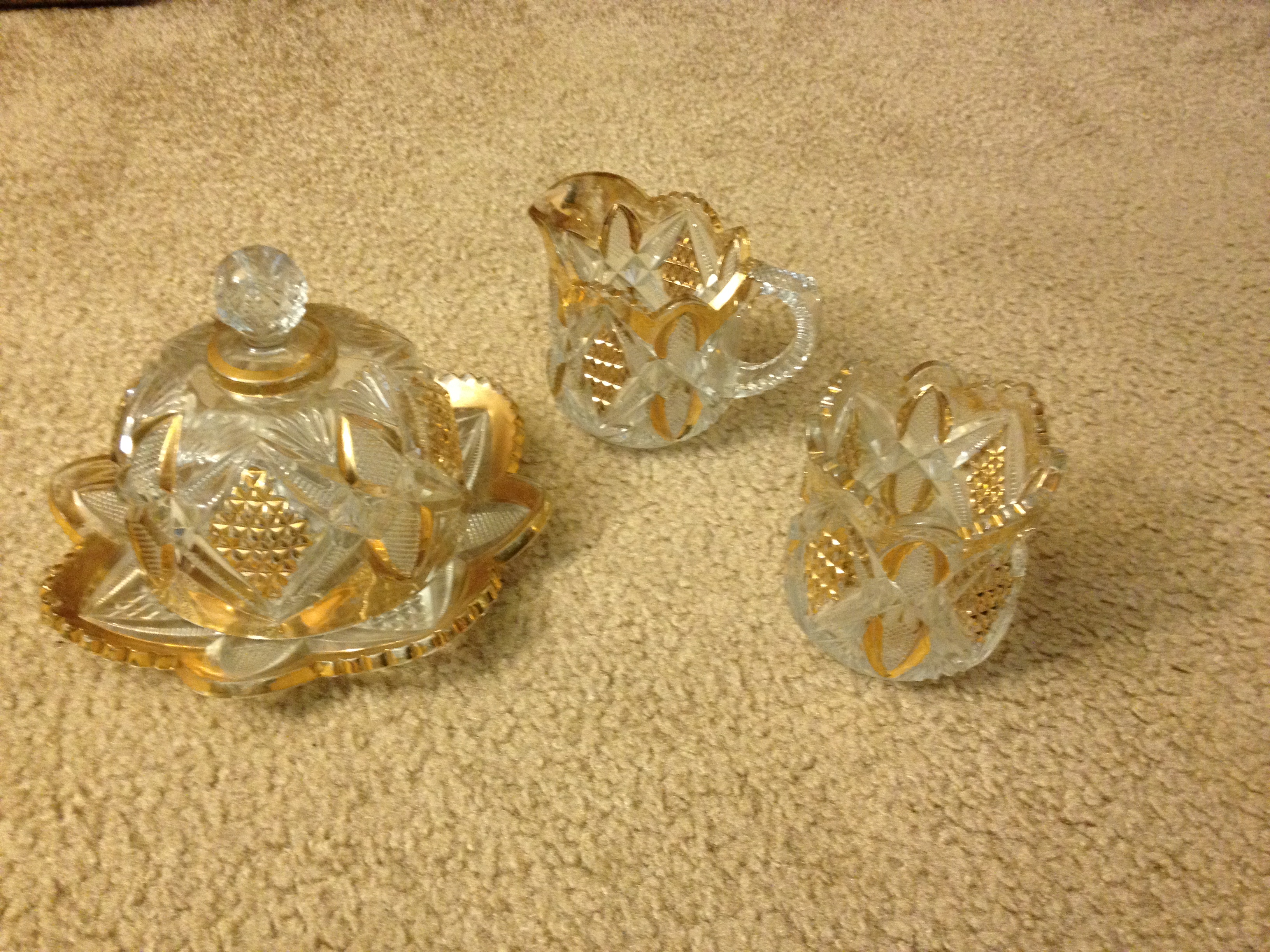 Re: Crystal or glass, gold inlay butter dish, creamer and...