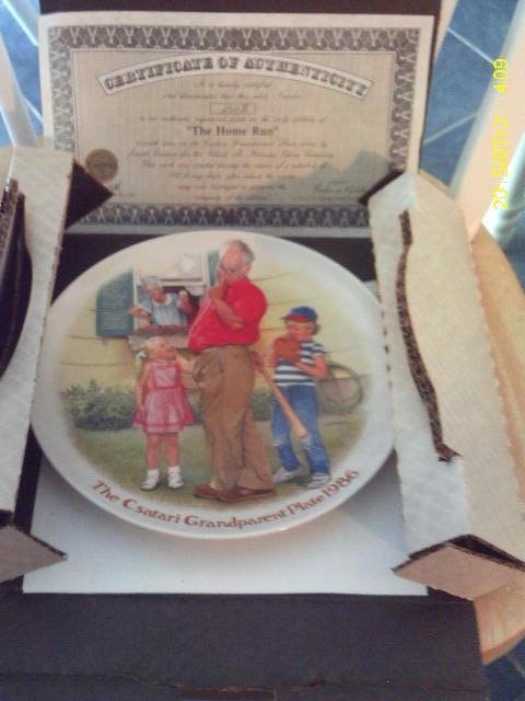 Eight Csatari Grandparent plates in orginial box with certificate. Excellent condition - "The Swinger" "Bedtime Story" "Sneak Peek" "The Skating Queen" "The Skating lesson" "Cookie Tasting" "Patriots Parade" and "Home Run". I have certificates for all of them except "The Skating Lesson".