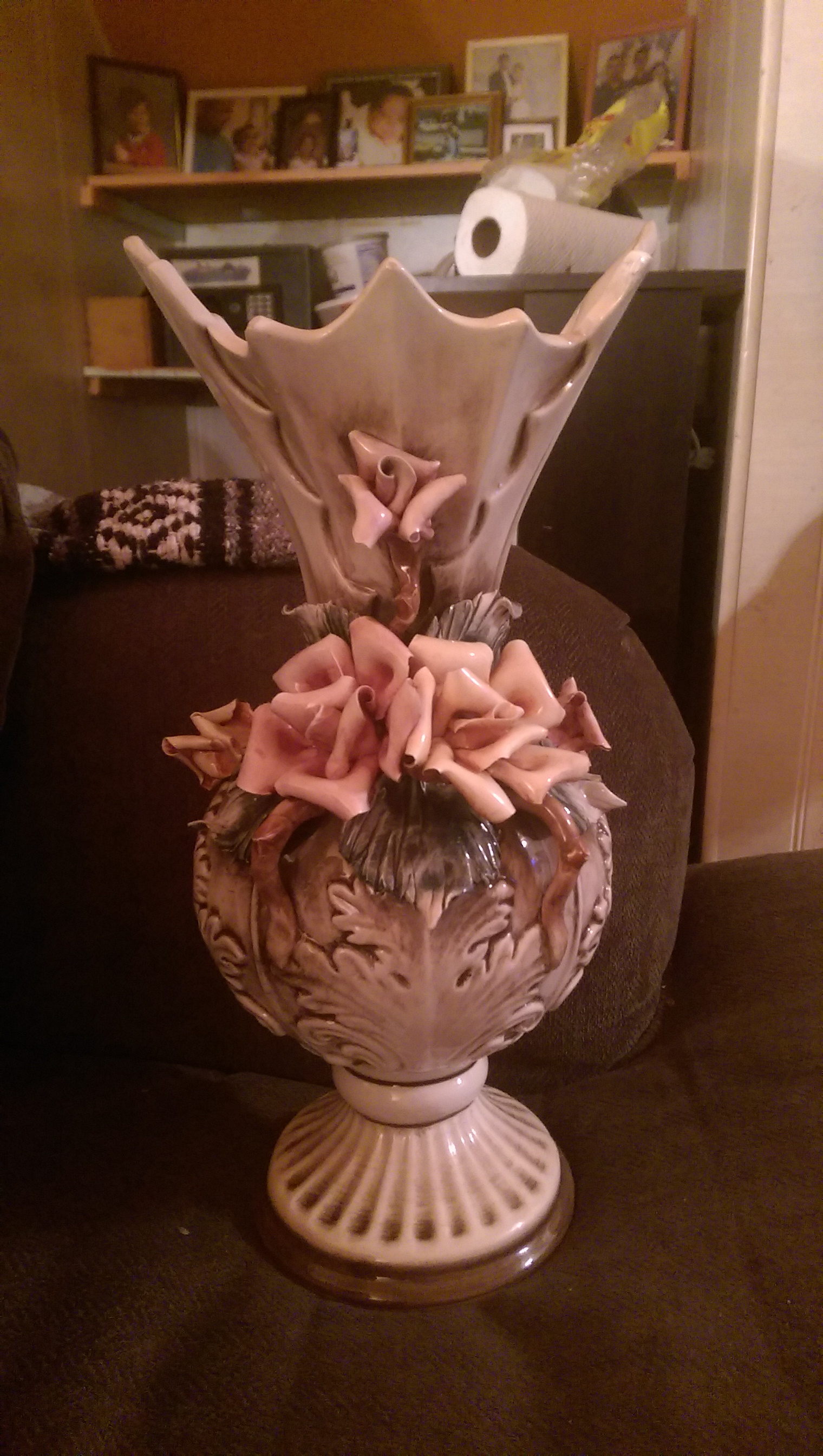 Approximately 13 " tall. Light tan with pink roses.