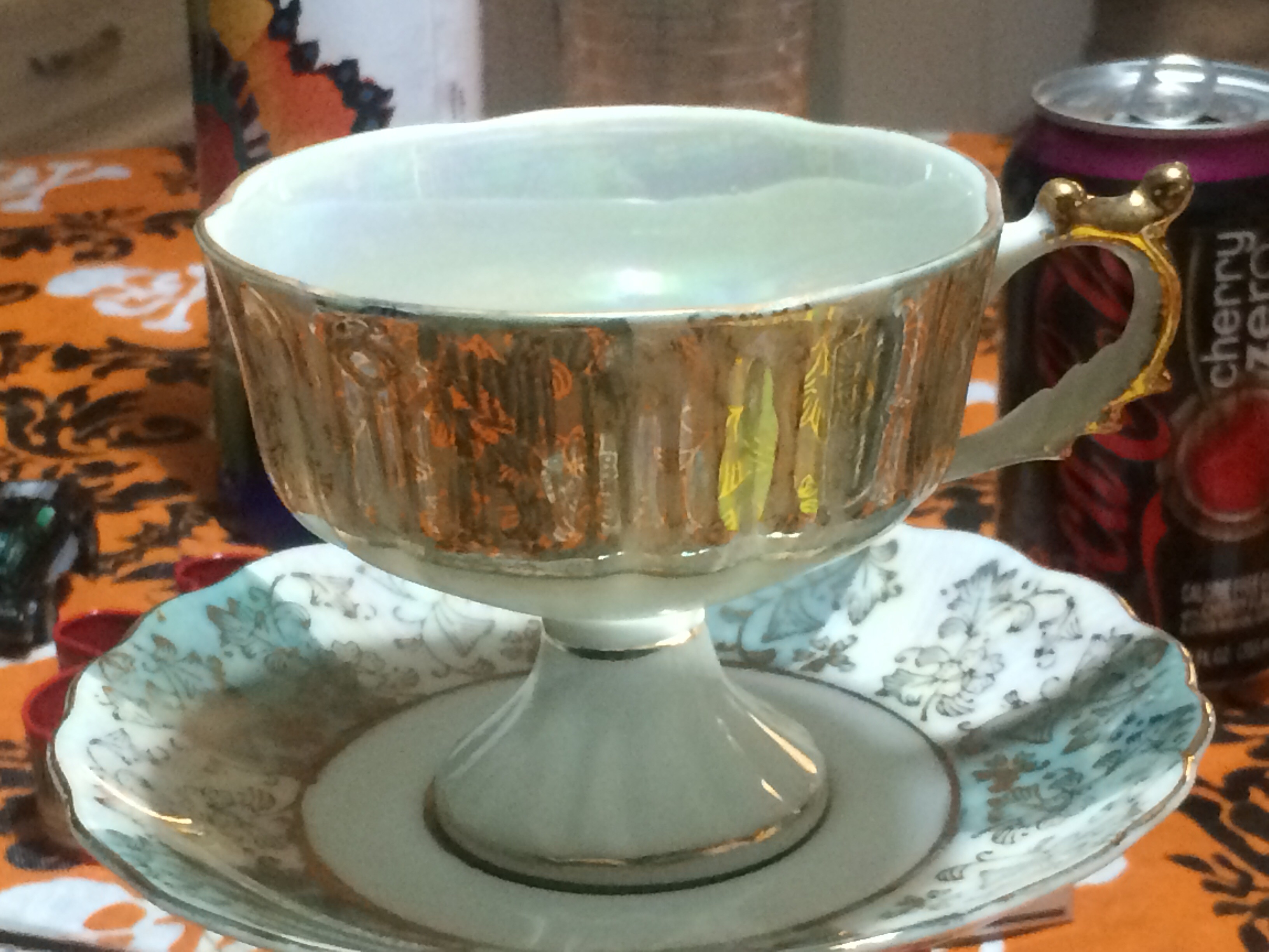 Grandmothers cups and saucers mint green rose pink and grey all floral design with gold lines around saucer and handle all gold the floral design is also done in gold. There is C-7215 in gold on bottom of cup and saucer.